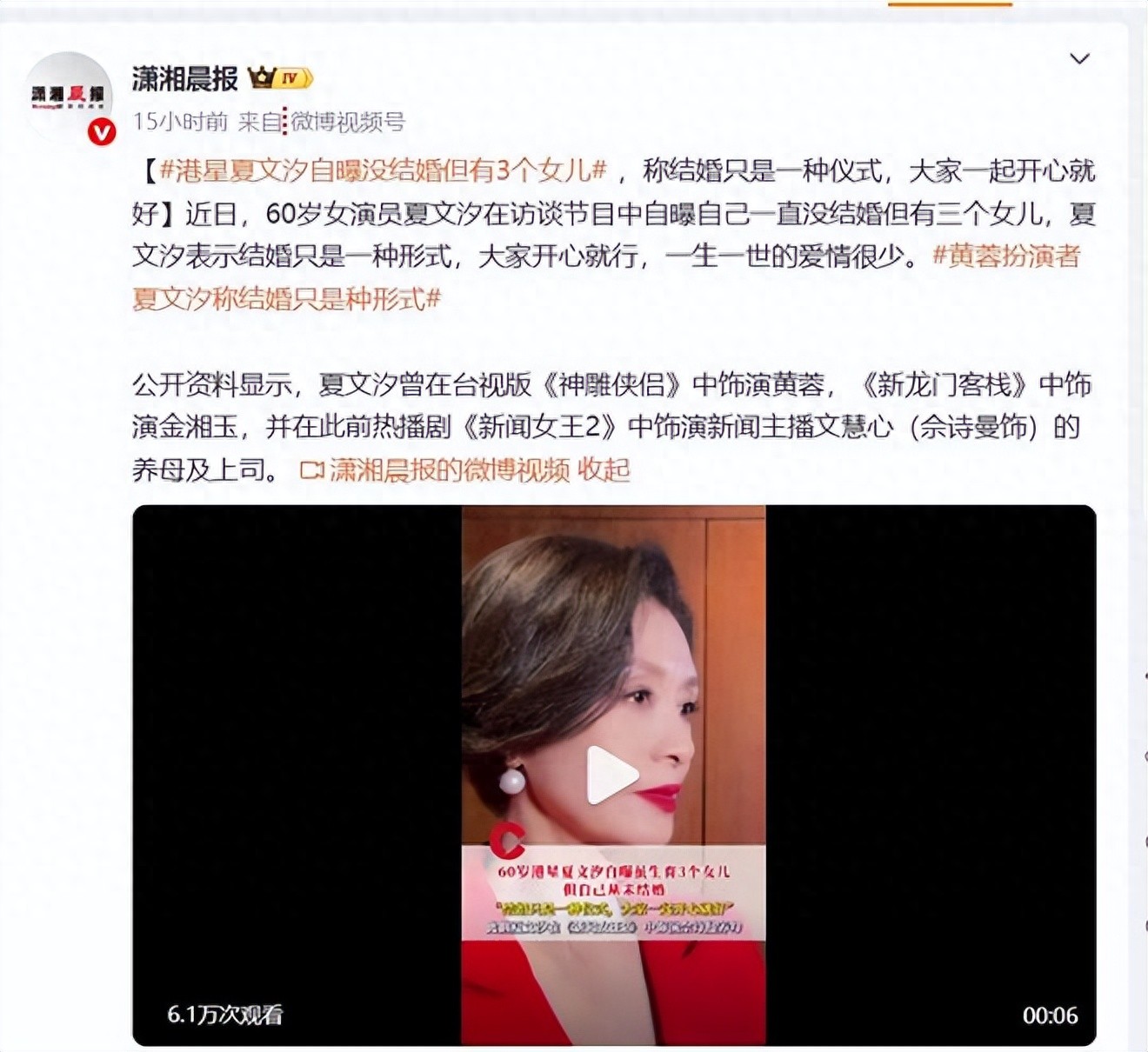 夏文汐不但表示自己从未结过婚,但与分手十几年的前男友黄冠博曾共同生活过并育有三个女儿,目前仍是单身,甚至还直言结婚在她看来就是一种形式。