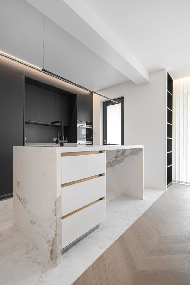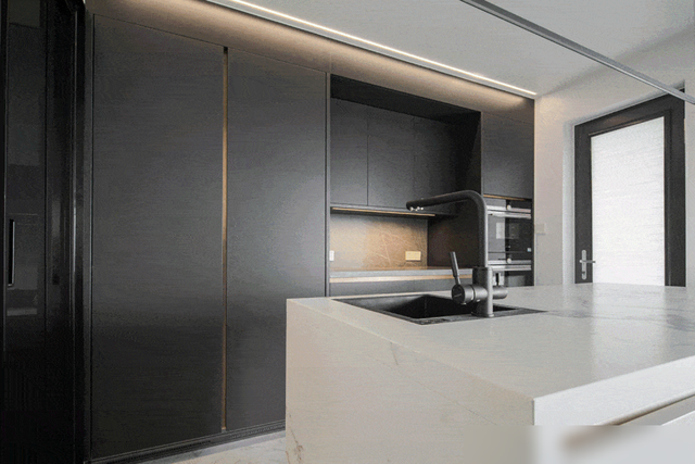 设计师用岩板中岛做核心,左边嵌水槽抽屉,右边留镂空座位区,同一个水龙头集成自来水和净水,岛台内部藏电源——原本可能杂乱的开放式厨房,变成了能边备餐边和客厅互动的"社交中心"。