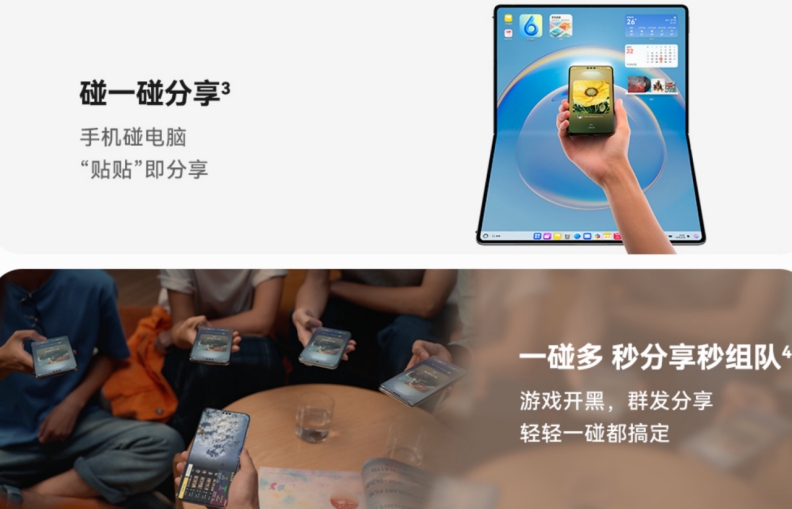 在跨年素材整理、内容分享时,nova Flip S的效率提升同样明显。全新“碰一碰”分享功能支持手机、平板、电脑之间快速互传内容,像日照片整理、学习资料共享都更省心。需要注意的是,其跟传统的分享文件/视频/照片不同,其可以分享内容的范围更广泛,例如某东的商品、小某书的笔记,甚至还能通过碰一碰快速跟朋友组队玩游戏。
