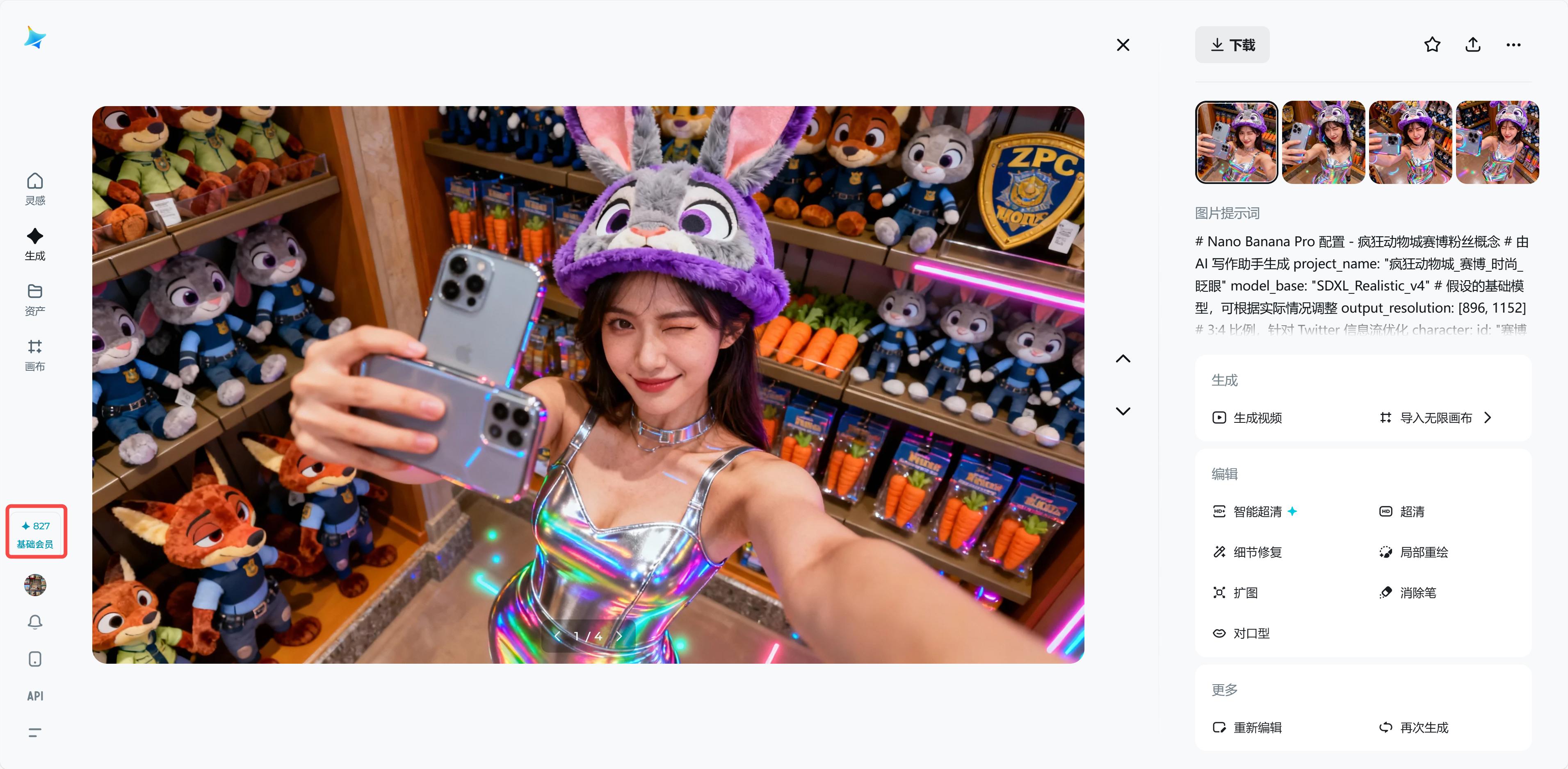 ✨重点来了!大家最关心的费用问题。我在生成之前,特意看了一眼我的账号积分:827 积分。生成完这组高清大图后,大家猜猜积分剩多少?