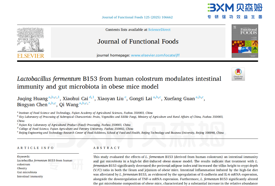 [2]Lactobacillus fermentum B153 from human colostrum modulates intestinal immunity and gut microbiota in obese mice model,Juqing Huang , Xiaohui Cai, Xiaoyan Liu, Gongti Lai , Xuefang Guan,Bingyan Chen ,Qi Wang,Journal of Functional Foods 125 (2025)