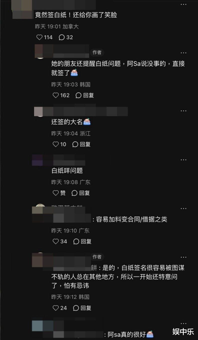 但热闹之中,有眼尖网友发现不对劲——阿Sa签名的载体居然是一张白纸!这下评论区画风突变,不少人提醒:“现在明星一般不签白纸了,怕被坏人拿去伪造合同或欠条啊!”其实这位粉丝当时也警觉了,特意问了阿Sa是否介意,没想到阿Sa和朋友都表示“没事儿”,直接大笔一挥就签了。