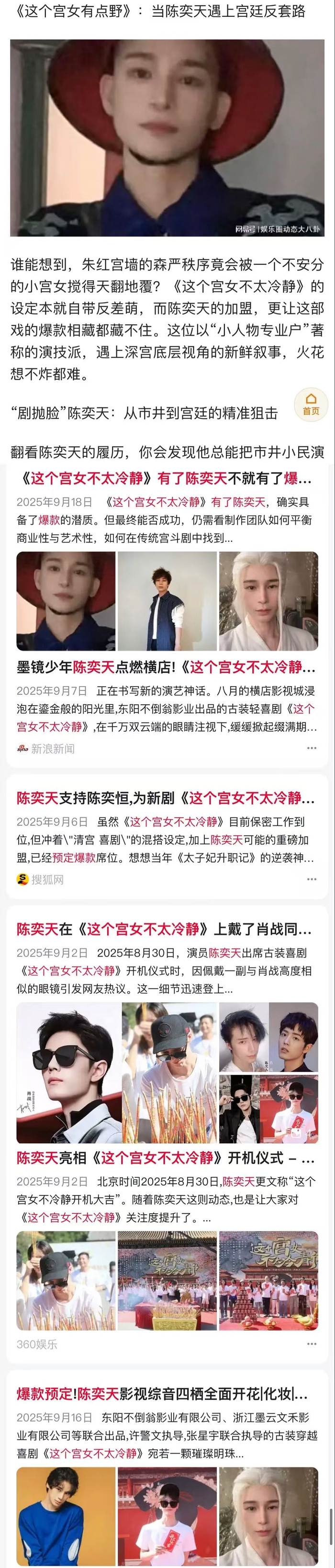 早在《这个宫女不太冷静》开机前,陈奕天就成了剧集的“热度护身符”。业内媒体直言,有他加入的剧组已经踏入爆款之门,自带顶级关注度,无需刻意营销就能引爆热议。开机当天,他的一组路透照直接引爆全网,佩戴的墨镜与顶流肖战同款,#陈奕天肖战同款墨镜# 话题瞬间冲上热搜,单靠一张照片就为剧集拿下首轮重磅曝光。