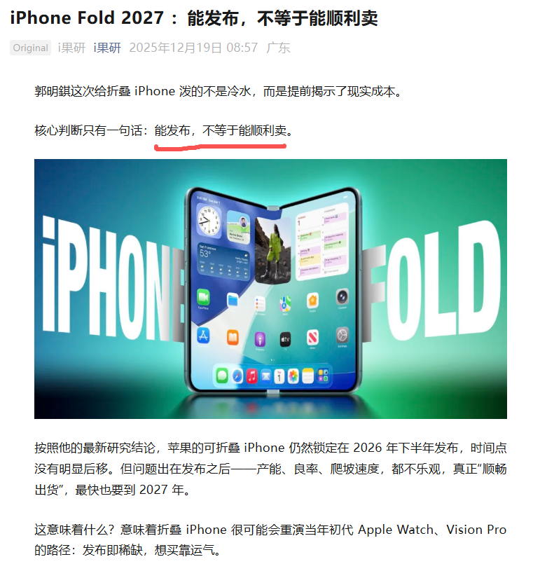 但郭明錤说了:能发布,不等于能顺利卖!产能、良率、爬坡速度都不乐观,说不好2026年发布,一年后才能到手!