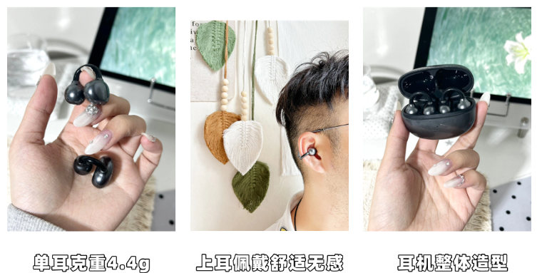 佩戴体验:4.4g挂耳朵上几乎没感觉,耳夹的弧度做的刚好,我戴了一下午也没觉得夹耳朵,蹦跶两下也不掉,戴眼镜也不硌,舒适度直接拉满。