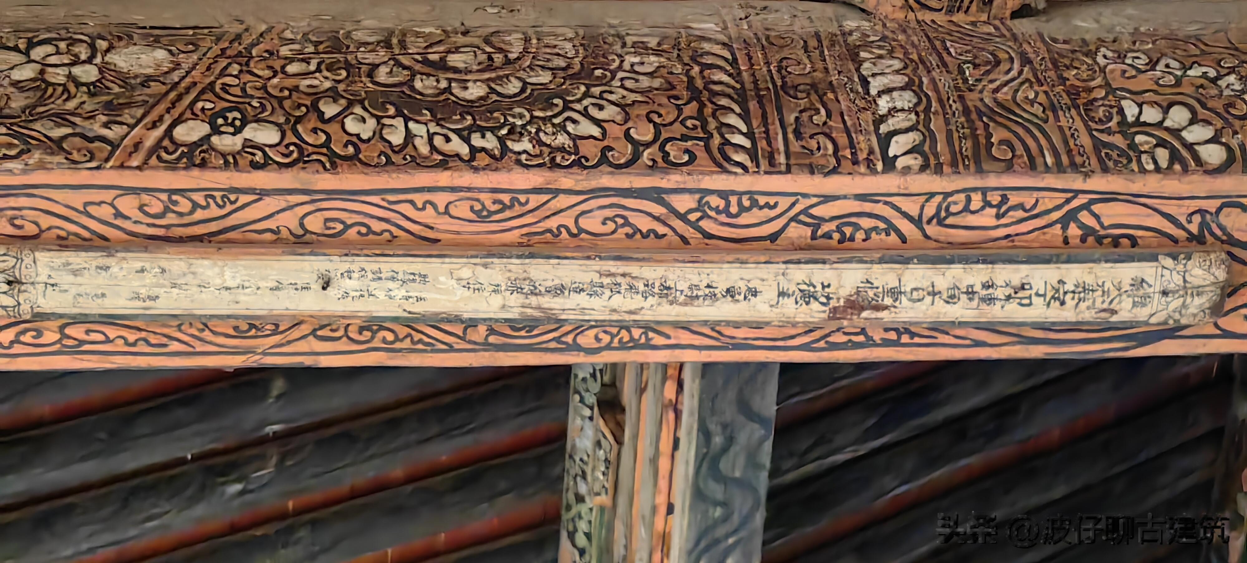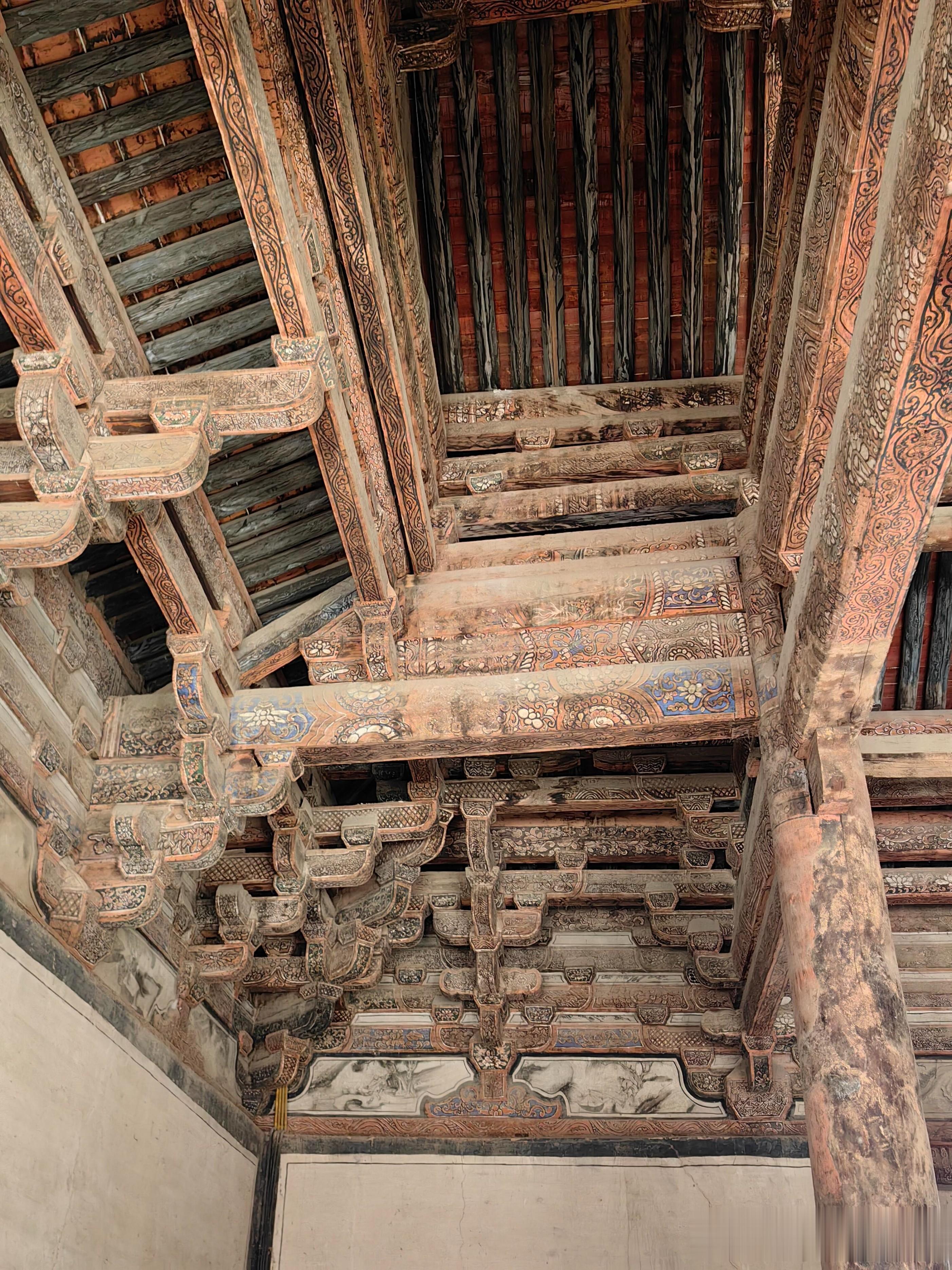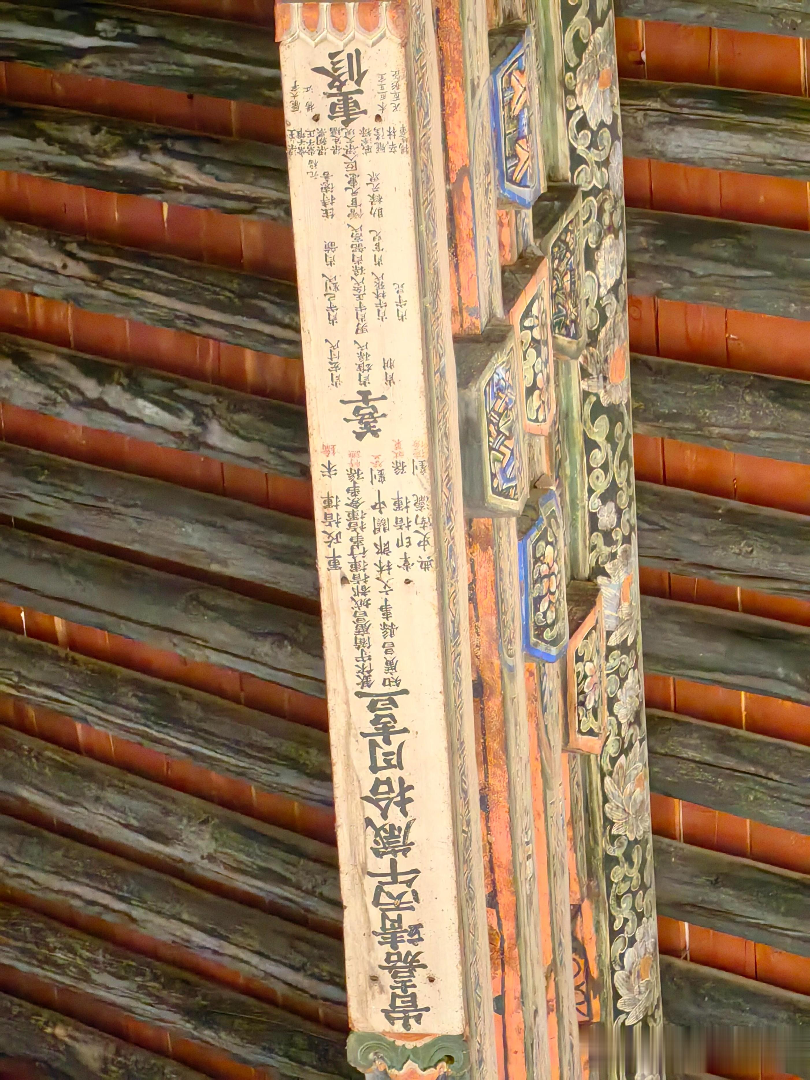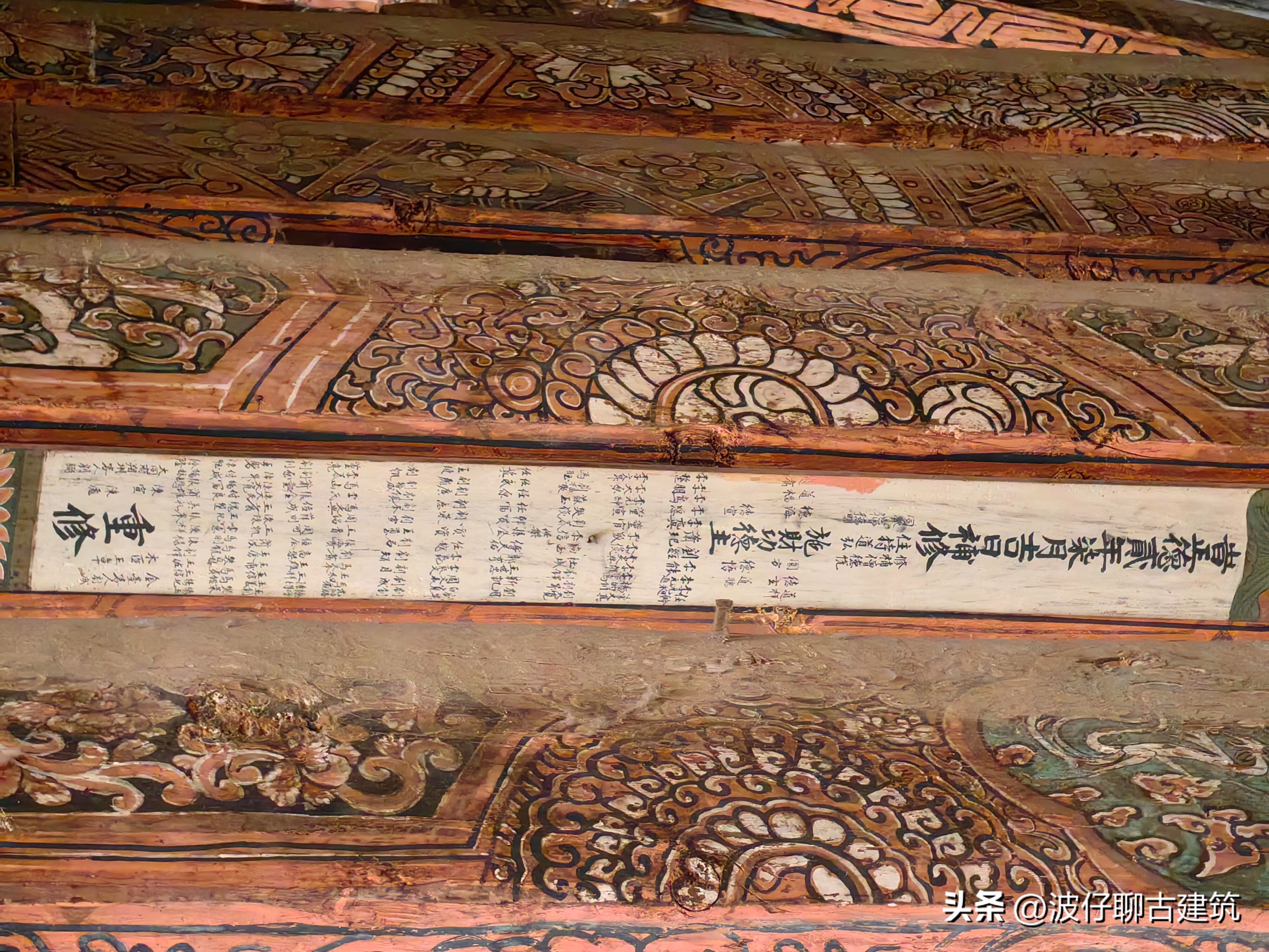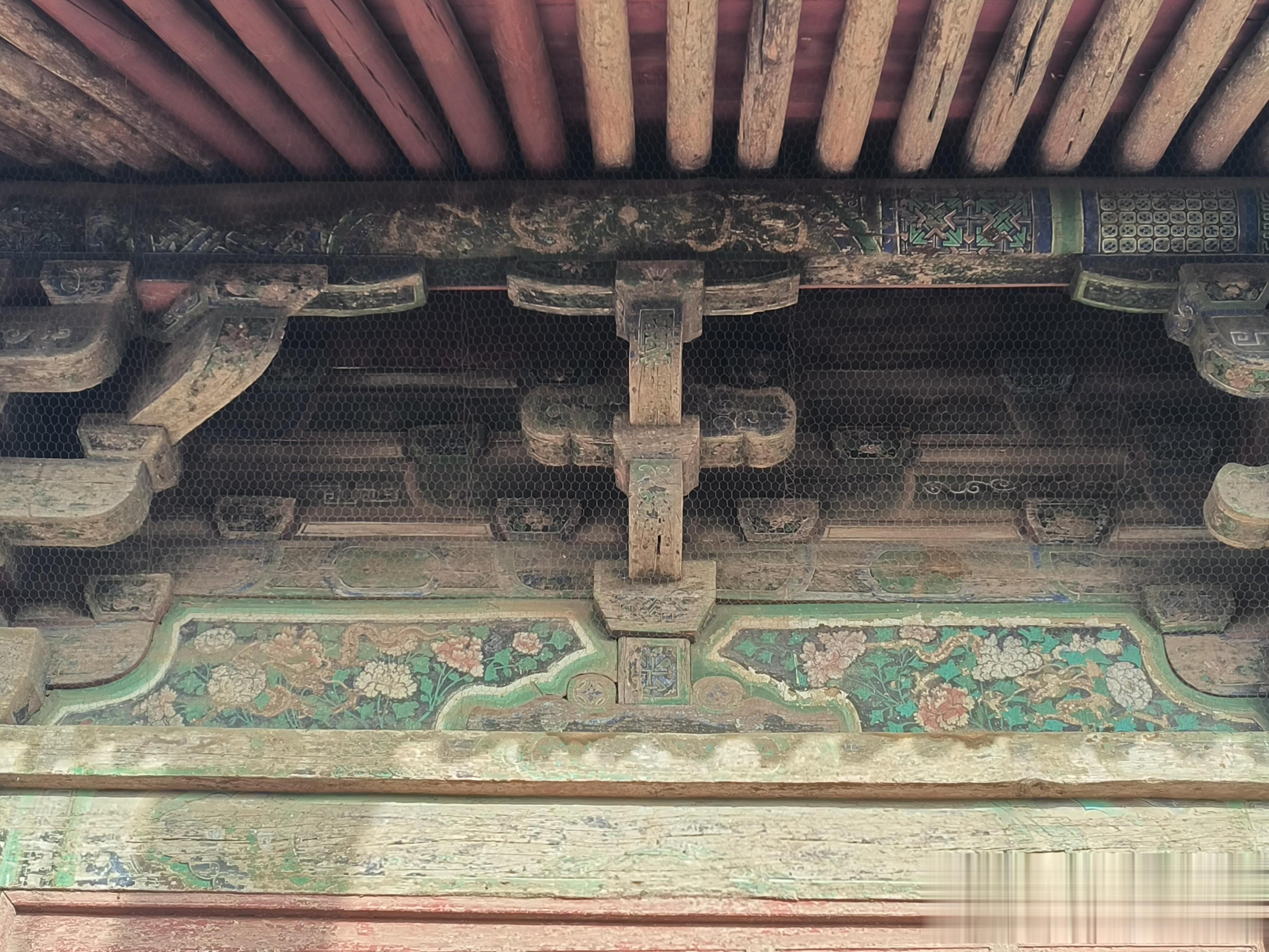 殿顶与梁架的彩绘,是另一重不可复制的价值。莫宗江先生当年考察后明确指出,文殊殿外檐彩画是《营造法式》中“五彩杂间装”的最早实例,以石青、石绿、土红为基调,点缀金箔,在唐辽建筑中首次将青绿色系用于外檐,彻底改变了此前唐辽建筑素朴土红刷饰的面貌,开启了后世建筑彩绘华丽化的先河。斗拱、拱眼壁、撩檐槫上,团花、行龙、二龙戏珠、四凤纹等纹样笔致流畅,虽经清代光绪年间重描,仍保留辽代原构的线条与设色逻辑,矿物颜料历经千年不褪,金箔依旧隐约闪光,可见当时用料之考究、工艺之精湛。殿内东西北三壁的辽代壁画,以沥粉贴金技法绘制,人物尺幅巨大,线条流畅,设色厚重,曾被明代黄泥覆盖,意外得以完整保存,裸露部分的凹凸质感与鲜艳色彩,尽显辽代宫廷画师的水准,与殿内木构、窗棂、彩绘共同构成完整的艺术体系,让这座殿宇成为辽代宗教艺术与建筑美学的集大成者。