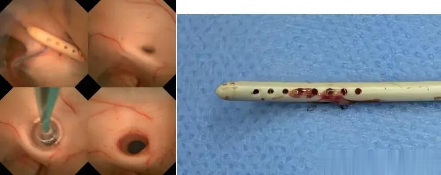肖庆主任团队为男孩施行了“神经内镜检查术+脑室腹壁长程引流术+分流管去除术”,术中发现脑脊液稍浑浊,脑室壁有污秽灰黑点样增生附着,脑室后角见膜样增生形成——这些都是颅内感染的表现。肖庆主任清除了膜样增生,冲洗了脑室,发现导水管已闭塞。使用3F球囊导管造瘘扩张导水管成型后,内镜得以进入扩张的第四脑室。探查发现第四脑室双侧侧孔、正中孔均闭塞,脑室壁有假包膜膜样增生和增生微血管。最终,在内镜引导下将脑室分流管精准放置,从额部经右侧脑室-右侧室间孔-第三脑室-直达第四脑室。