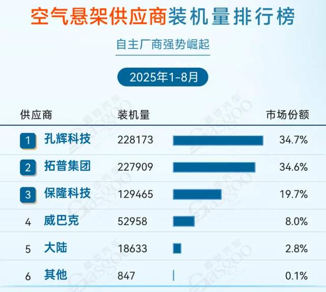 如上图所示,这是2025年1-8月份,国内汽车空气悬挂的具体市场情况,可以看到已经完全是国产的天下了,前三大品牌孔辉科技、拓普集团与保隆科技,牢牢占据前三名,其合计的份额已经高达89%了。