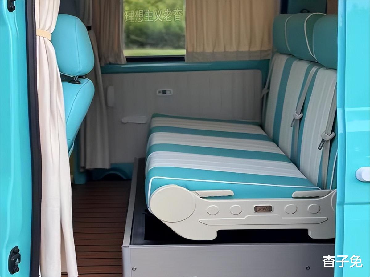 车内PVC条带打底,后排座椅换成了床车专用椅,座箱里面还可储物。