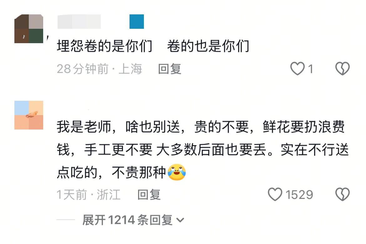 也有网友觉得都是家长们自己卷导致的,完全可以不送,你们自己选择了送礼物,还说怕被区别对待。