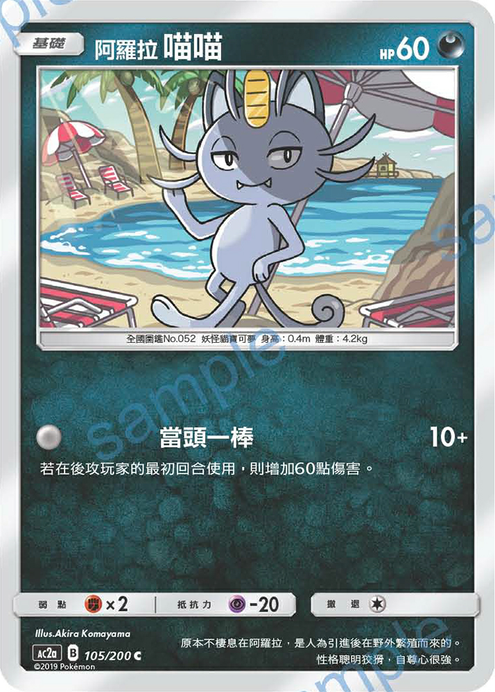 阿罗拉喵喵,妖怪猫宝可梦,属性(恶),身高(0.4米),体重(4.2千克),特性(捡拾:有时会捡来对手用过的道具,冒险过程中也会捡到。技术高手:攻击时可以将低威力招式的威力提高。),隐藏特性(胆怯:受到恶属性、幽灵属性和虫属性的攻击或威吓时,会因胆怯而速度提高。),弱点(格斗、虫、妖精),所属世代(第一世代),图鉴编号(052号)。