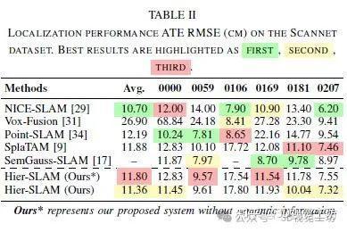 本文验证了Hier-SLAM在仿真数据集Replica和真实世界数据集ScanNet上的测试效果。 结果显示,本方法在建图与追踪精度上超越现有稠密 SLAM 方法,同时整体SLAM运行速度提升 2 倍。在渲染方面,渲染效果超过现有稠密 SLAM 方法,同时渲染速度可达 2,000 FPS,不含语义信息时可达 3,000 FPS。由于大语言模型助力,本工作支持在复杂真实场景中处理超过 500 类语义标签,充分展现出语义理解的可扩展性。