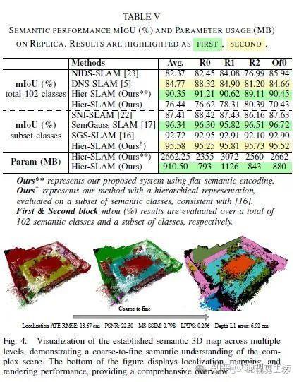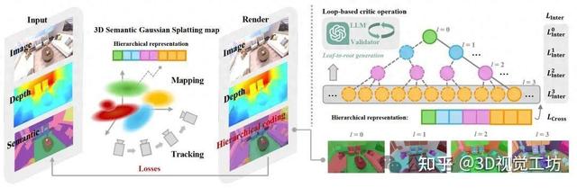为了解决这一问题,本文引入了一种紧凑的层级语义表示,将语义信息有效嵌入到 3D Gaussian Splatting 中,并借助大语言模型(LLM)的能力构建结构化语义编码。此外,本文设计了一种新的语义损失函数,通过层内(inter-level)和跨层(cross-level)联合优化,进一步提升层级语义信息的学习效果。本文还对整个 SLAM 系统进行了全面优化,显著提升了追踪建图性能及运行速度。
