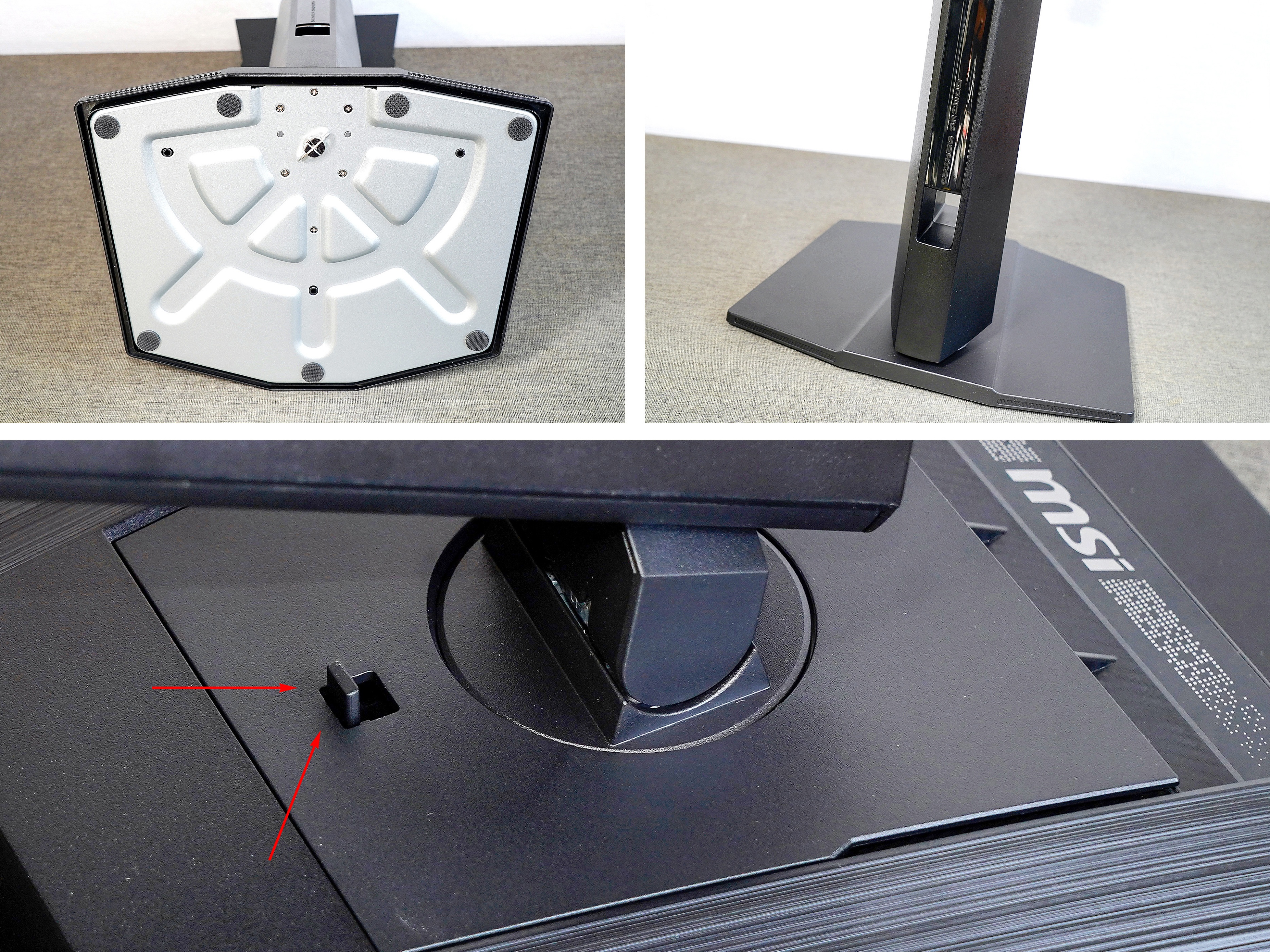 ▼底座为八边形的金属材质,底部贴有多个橡胶防滑垫来增加稳定性。支架柱有一个开口,用来走线。底座和支架的连接处采用了手拧螺丝,不需要任何工具就可以安装。显示器与支架采用快拆装设计,想要拆下时,抬起下面的拨杆就可以实现分离。