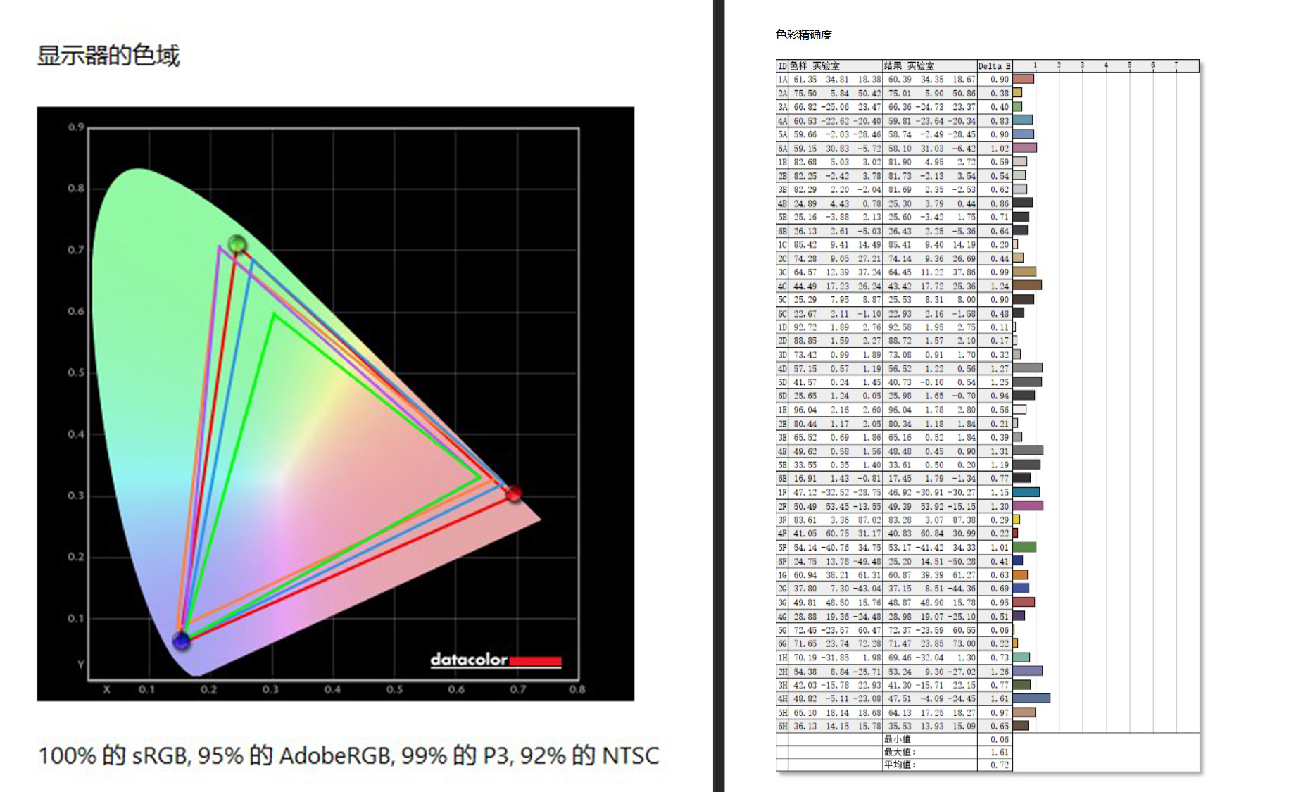 ▼官方给出了138%sRGB色域值,由于这是容积率的算法,使用Spyder5 Elite测试只能按覆盖率来计算,所以最终值最高只有100%了。DCI-P3色域值达到了99%,和官方值一致(用户模式)。在48种颜色的色准测试中ΔE平均值为0.72,非常让人惊喜!