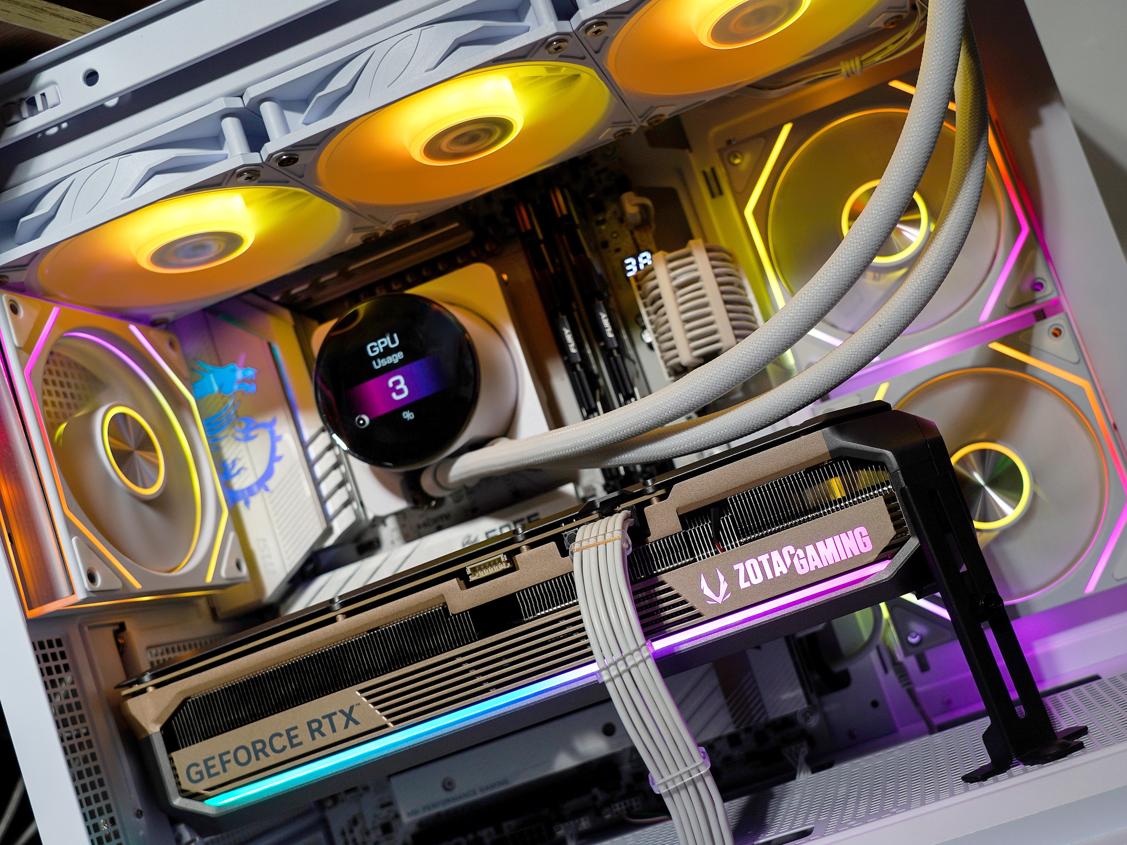 ▼ZOTAC GAMING的LOGO和贯穿的乳白色条都是具有ARGB灯效,灯光面积控制的比较适度,绝对不会有杀马特的效果。
