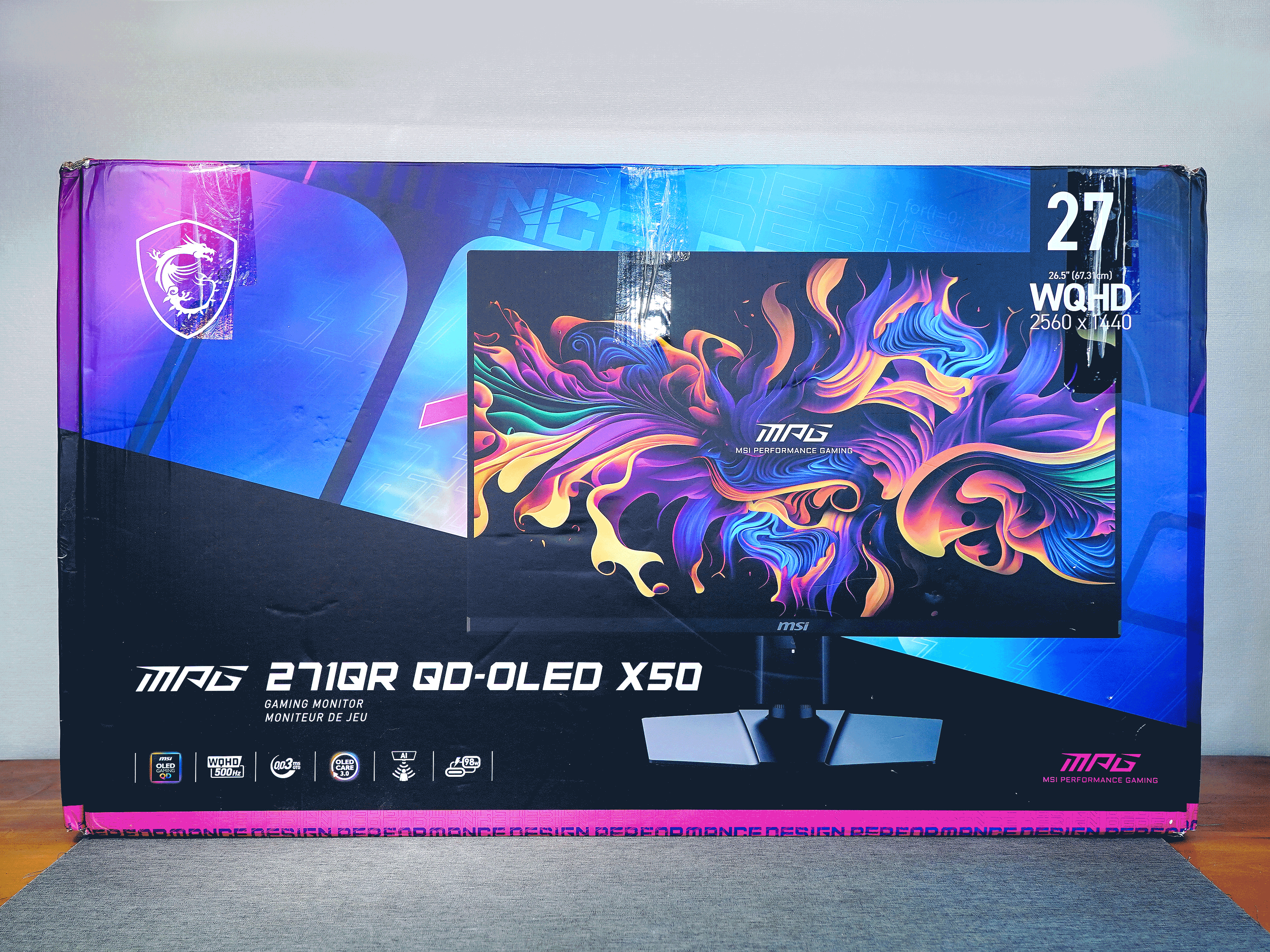 开箱开机▼外包为彩装,两面分别是显示器的正反面渲染图,左下角标注了显示器型号,以及OLED屏、500Hz刷新率、0.03ms响应等显示器的主要卖点。
