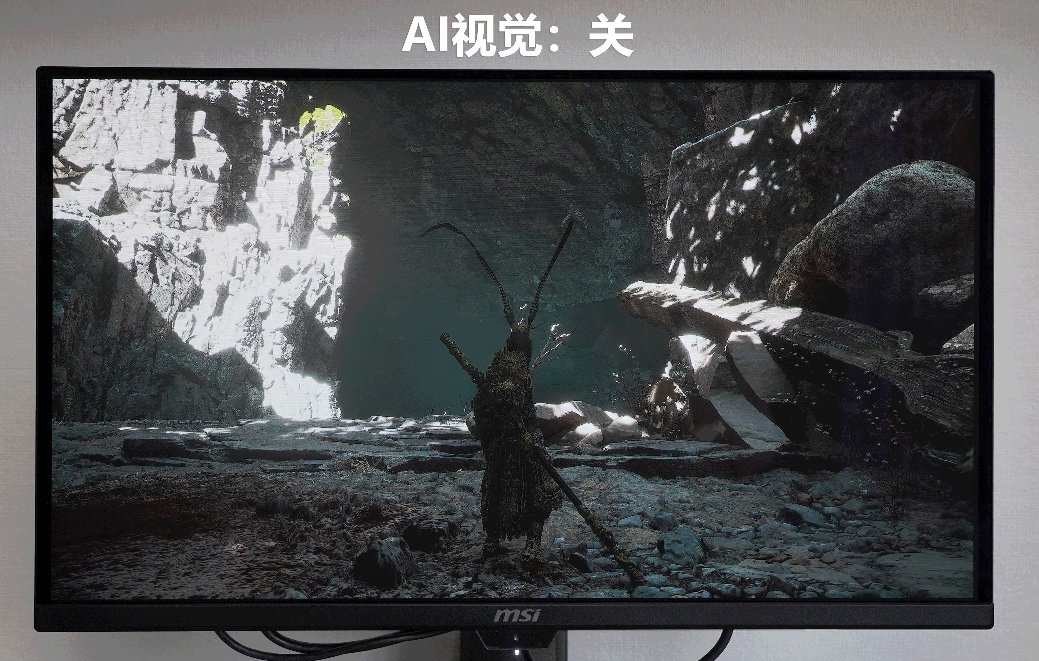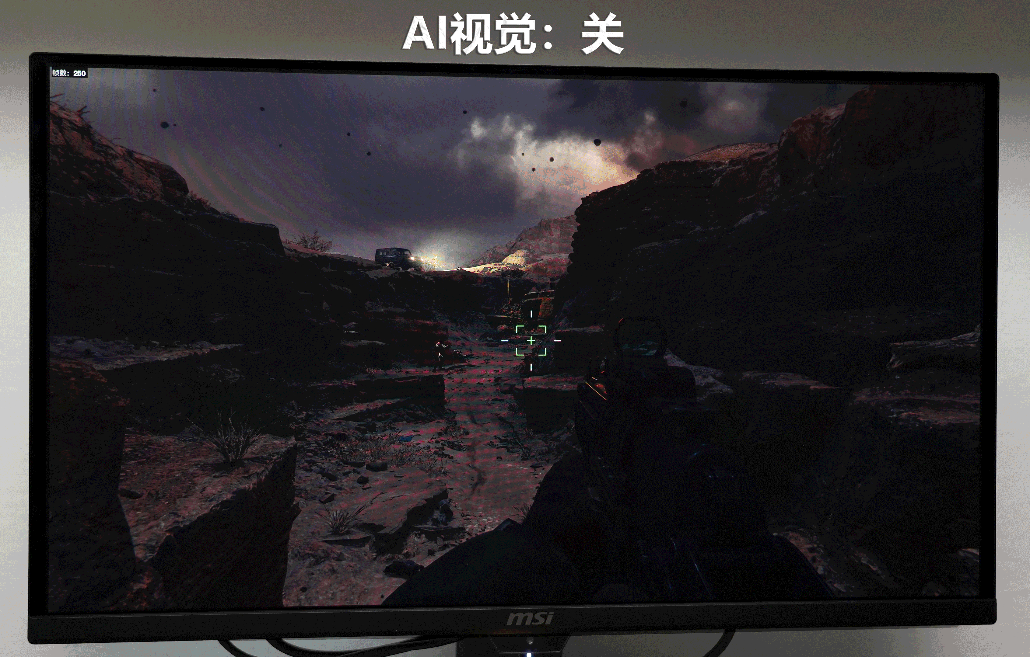 ▼OLED的黑色不发光,能真正黑的下去,这是优点,但有时候也是缺点。在一些游戏的暗场景中,死黑的画面基本看不到任何东西,观感反而不好。 开启OSD中的 “AI 视觉” 模式,显示器会自动优化画面的亮度和对比度,这类似于很多显示器的“夜视”功能。该功能有3个级别,级别越高,画面也会越亮。