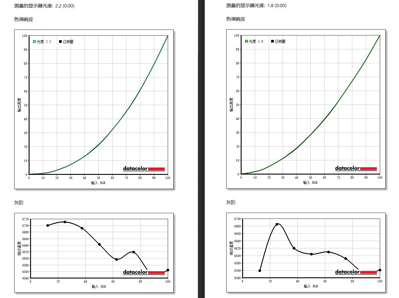 ▼在OSD中分别把Gamma值设定为2.2和1.8,测试结果完全贴合2.2和1.8的曲线(建议选择2.2的曲线,也是默认值),灰阶方面在6500~6700k左右,没有像一般电竞显示器那样过分地偏冷。