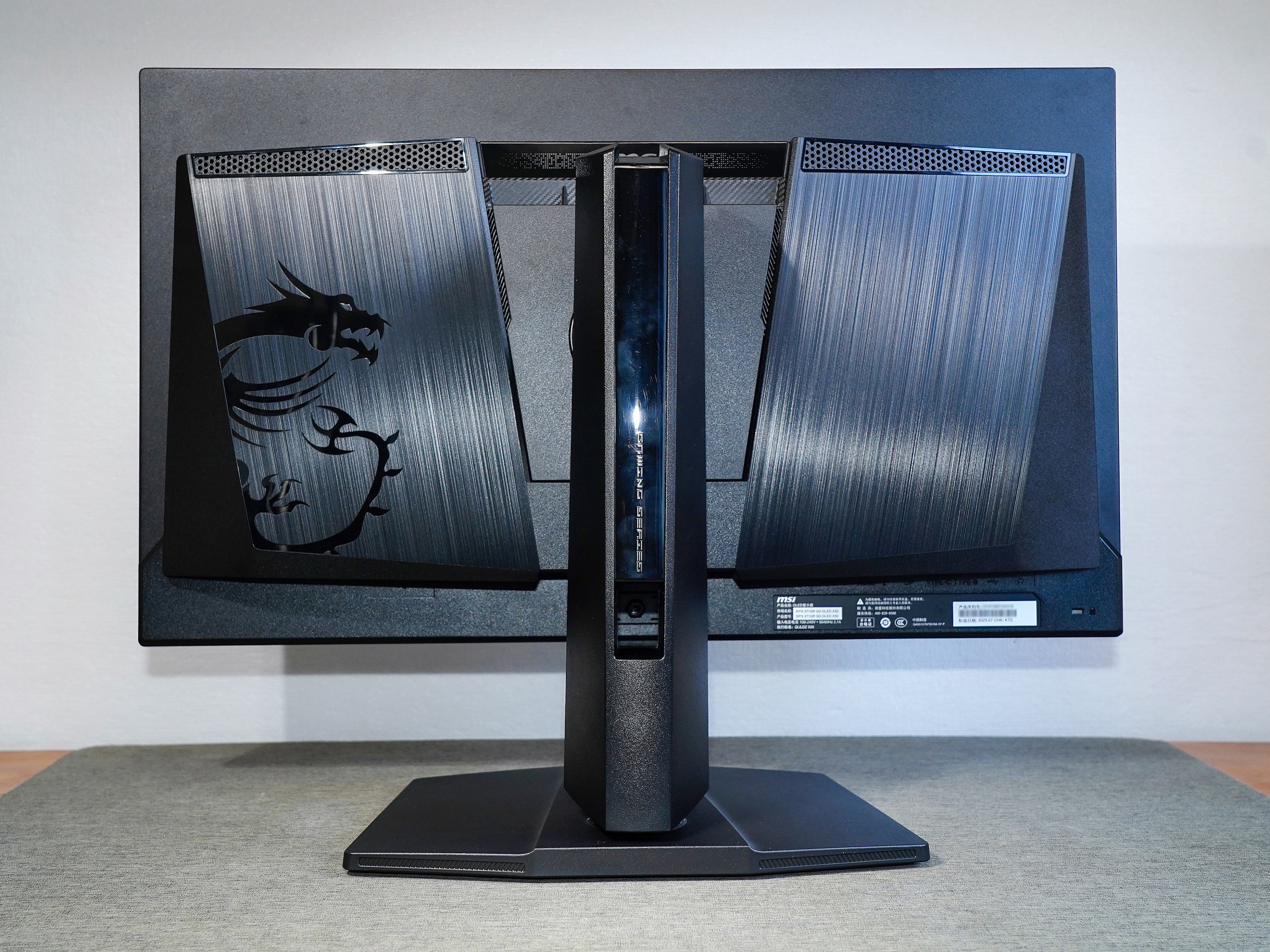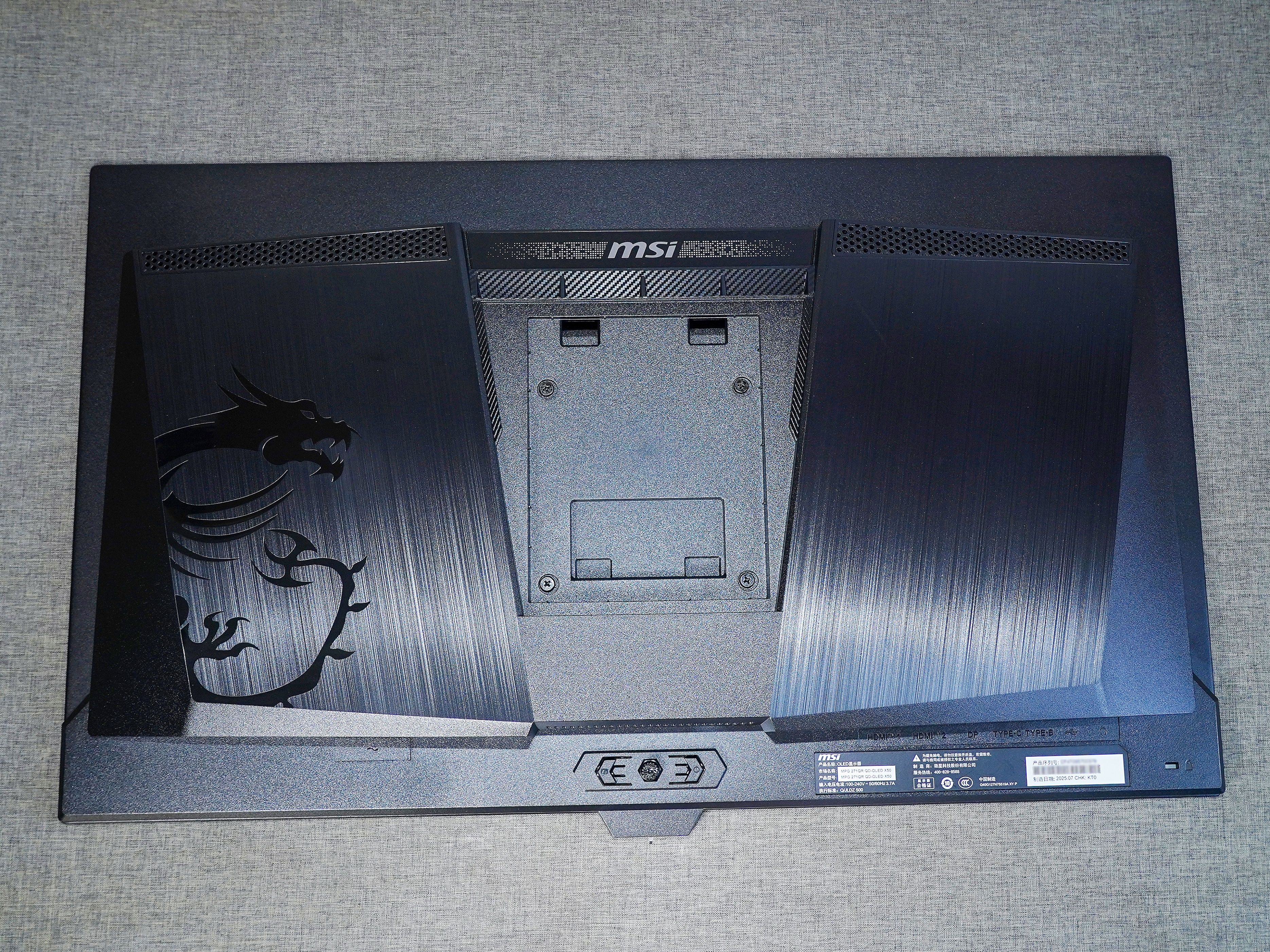 ▼背面左侧的龙盾LOGO比较大;下面中间配备了五维摇杆导航键,手感相当的好;上面的MSI标识具有ARGB效果;中间孔位支持 100x100mm 的 VESA 支架。