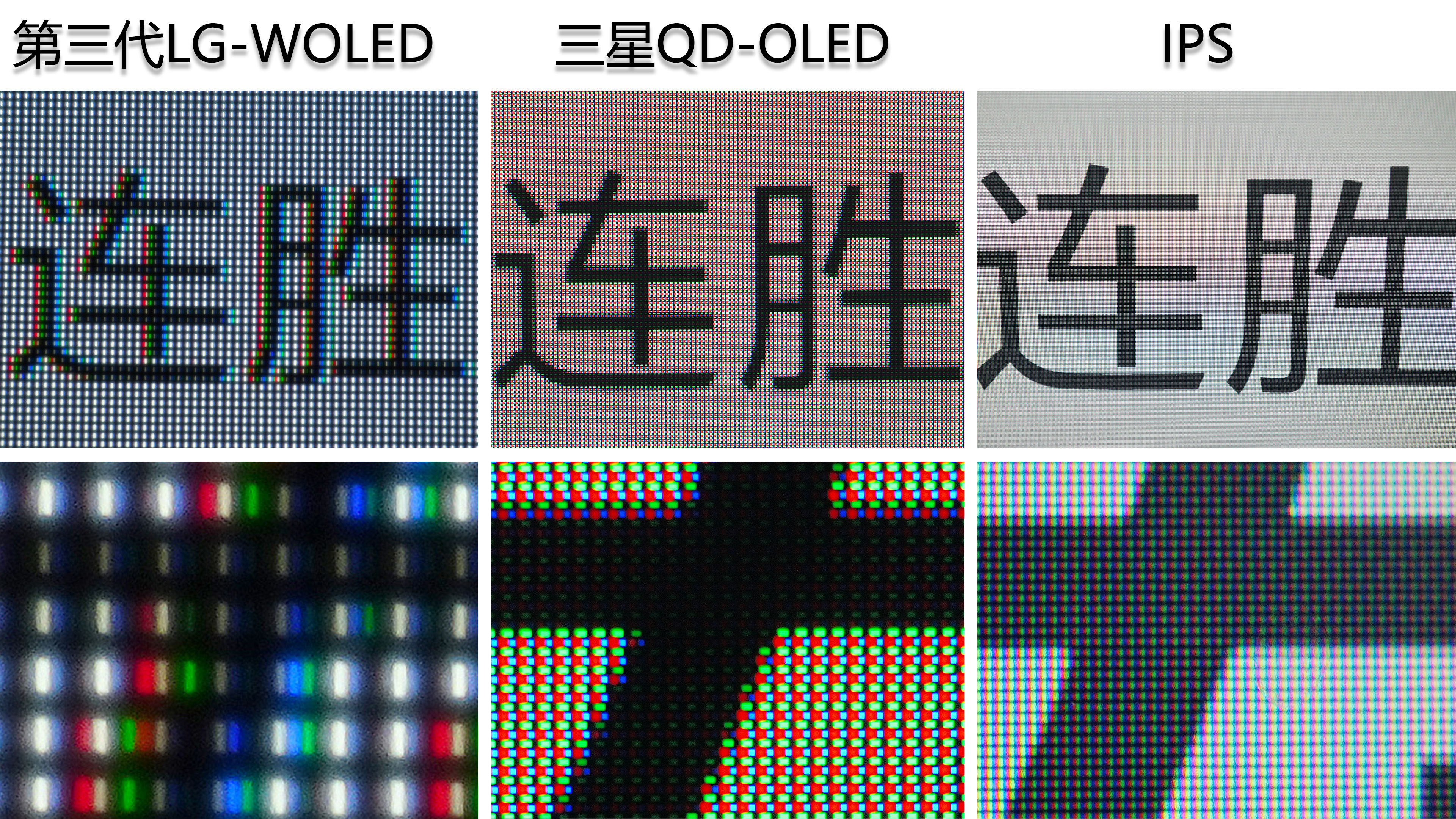 ▼QD-OLED使用蓝色OLED作为发光源,然后用量子点(QD)层将一部分蓝光转化为纯净的红光和绿光。而WOLED使用白光作为发光源,然后使用彩色滤光片创建红、绿、蓝三个子像素,并保留白色像素专门用来显示白色。从实际的效果来看,QD-OLED技术的文字彩边更不明显。