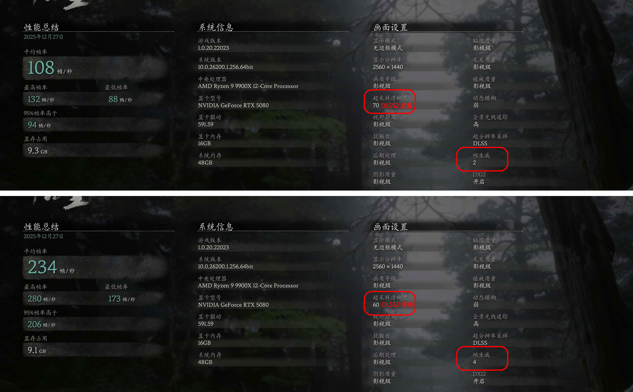 ▼当然以上是benchmark的成绩,实际上不同场景表现也不会不同,比如对战二郎神的场景中,超采样:平衡+帧生成x4可以达到260fps以上。对于这种非FPS类游戏,个人觉得还是画质更加重要,不必为帧数而降低画质。