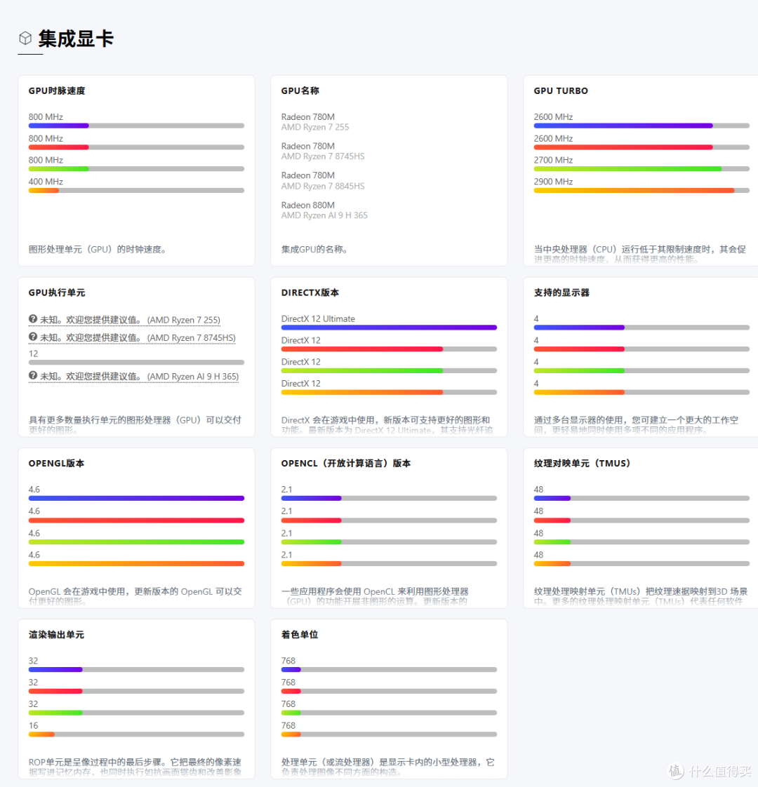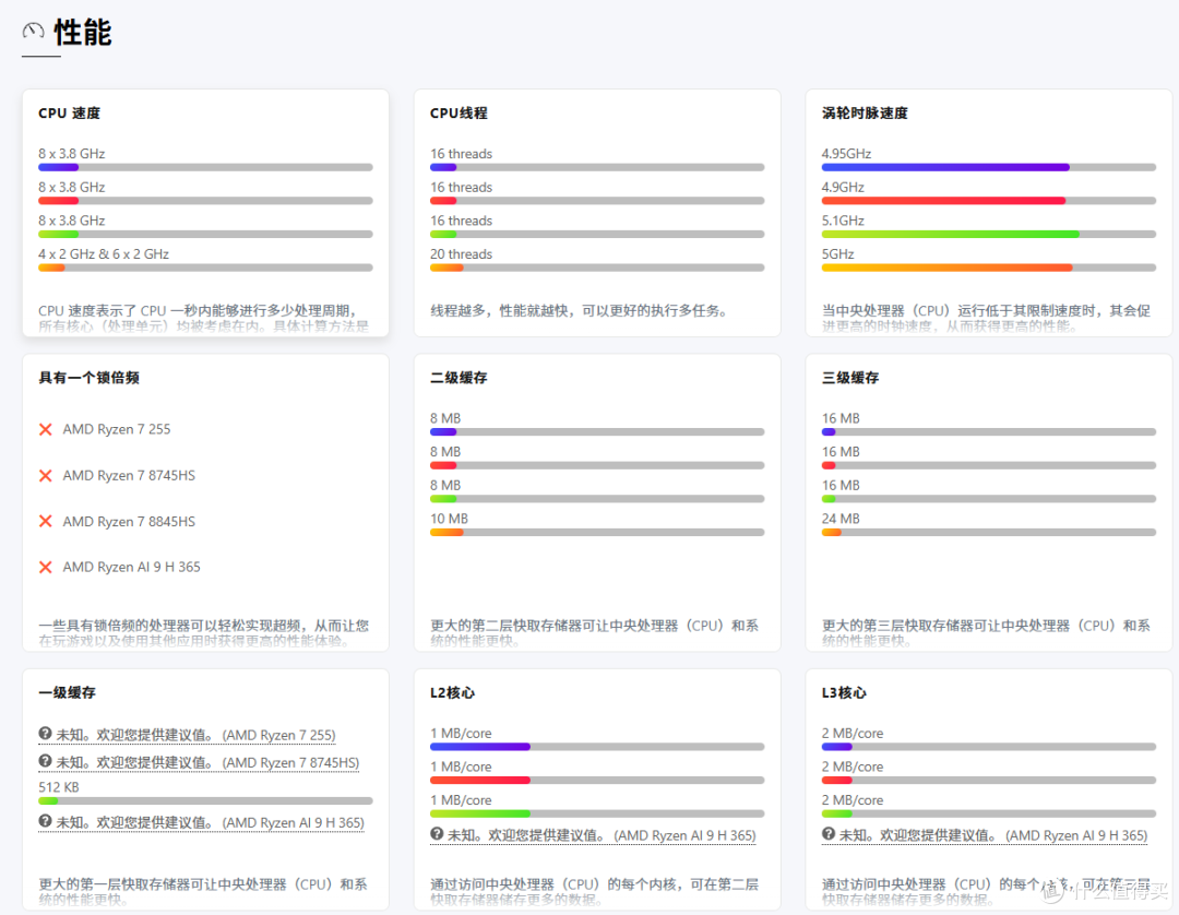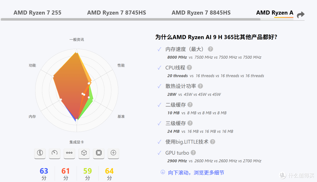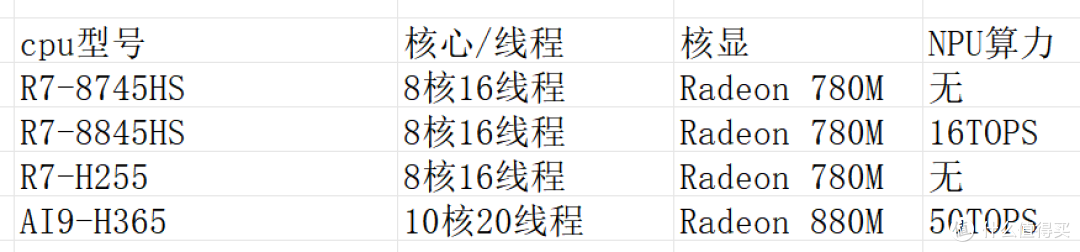 R7-8745HS、R7-8845HS、R7-H255三款处理器,均为8核16线程,集成Radeon 780M核显,其中8845HS相比8745HS/H255频率略高0.2GHz,带有NPU(16TOPS AI算力)这点算力够干啥的。AI9-H365价格又太贵,虽然NPU算力达50TOPS,但是这点算力,对一般使用场景来说性能提升并不是很明显,那说实话真需求ai还得是去买n卡。