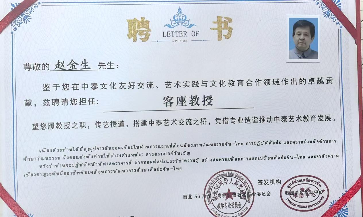 为庆祝中泰建交50周年,深化中泰人文交流与教育合作,由泰国清迈华助中心联合泰北56所华人高校联盟教学专业委员会牵头主办的“中泰建交50周年国际艺术展暨学术访问交流活动”,近日在崇华新生华立学校隆重举行。赵金生先生应邀担任客座教授一职。