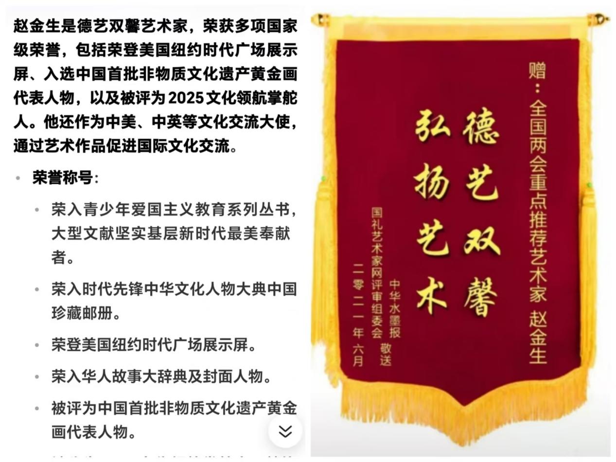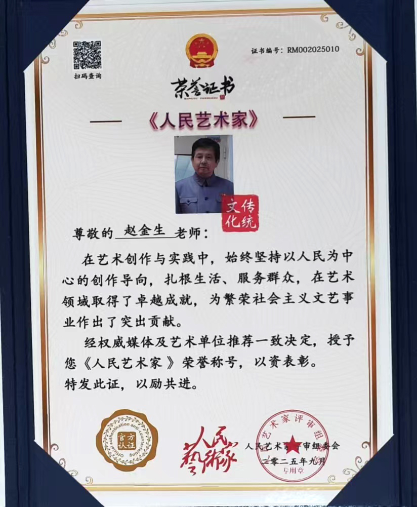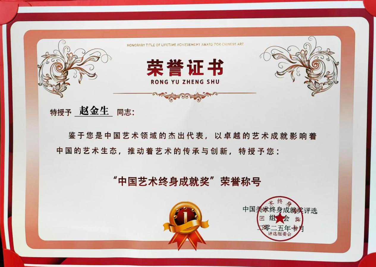 中华家风馆智库特聘专家,中国韶山网驻站会员,红馆理事,艺术中诺贝尔奖获得者,世界文学届功勋艺术家,“中国文学艺术杰出贡献功勋艺术家”,“国际和平艺术领军人物”中国邮政和澳门邮政联合出版的庆祝中华人民共和国成立76周年大型文献类邮册,书法作品精忠报国、弘扬霍公精武精神、武魂、为实现祖国统一大业而奋斗、实事求是、厚德载物、不忘初心!牢记使命!荣入文献,作品《尚武永存》在中国安徽泾县宣纸博物馆参展,中赞文化交流使者、“世界艺术百家榜”中国名人,世界文化中国代表人物、中国杰出艺术家海外展播、国际文化交流大使、中国首批非物质文化遗产黄金画代表人物、《首届非遗中国年》重磅推荐艺术家、2025文化领航掌舵人暨献礼联合国成立80周年人民最喜爱的艺术大家,宫廷艺术家、中国当代艺术家奖金奖,中国关心下一代工作委员会教育中心北京地区美育中国文体嘉年华活动中,表现优异,荣获优秀导师,建国75周年大国脊梁新时代共和国突出贡献人物、孔子奖章终身艺术顾问,中国艺术家赵金生强势荣登世界艺术十大领军人物,翰墨青州.2024书画艺术展作品《精忠报国》入展。