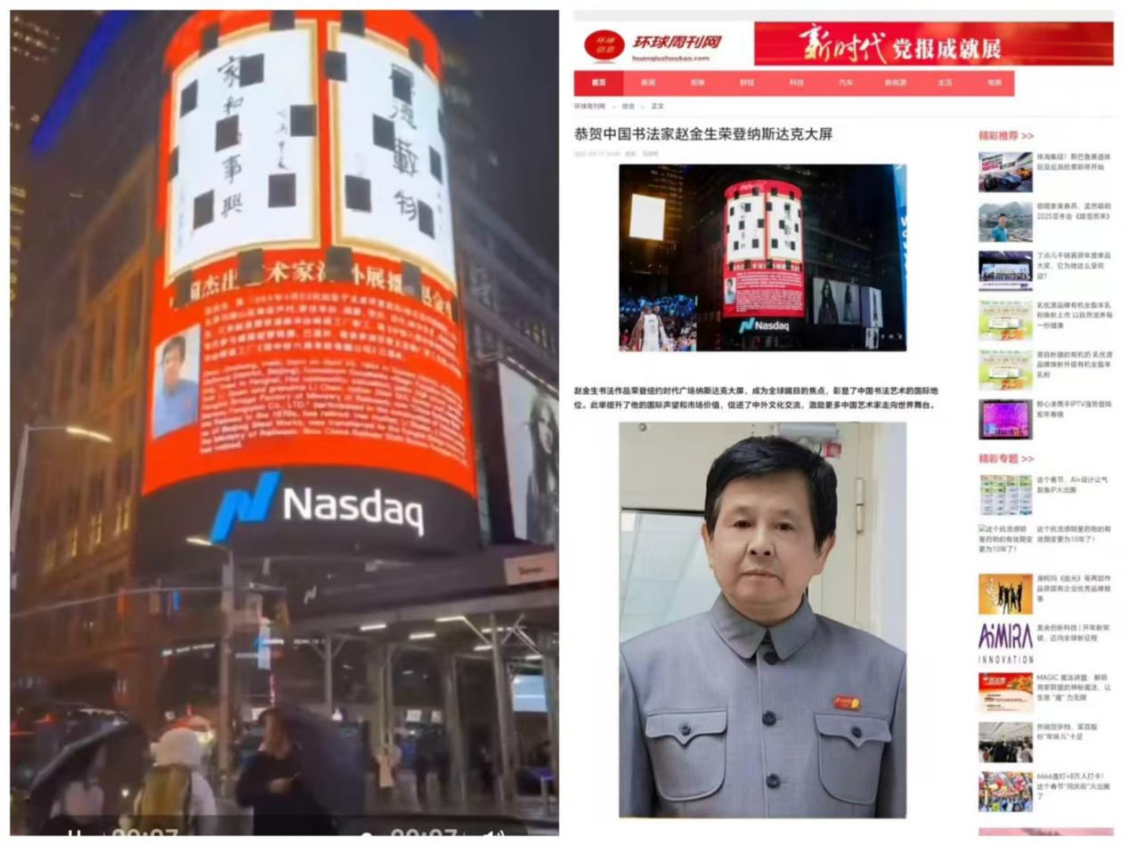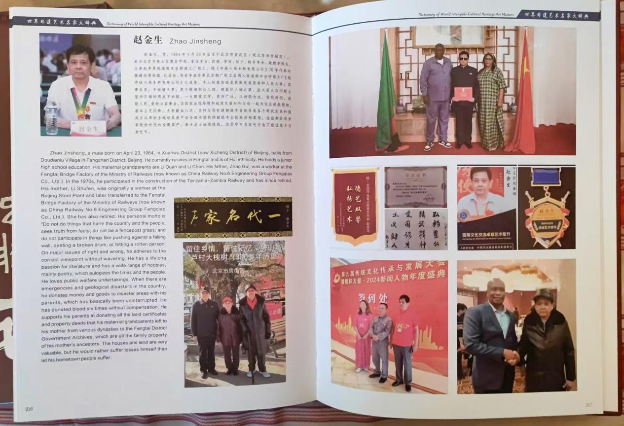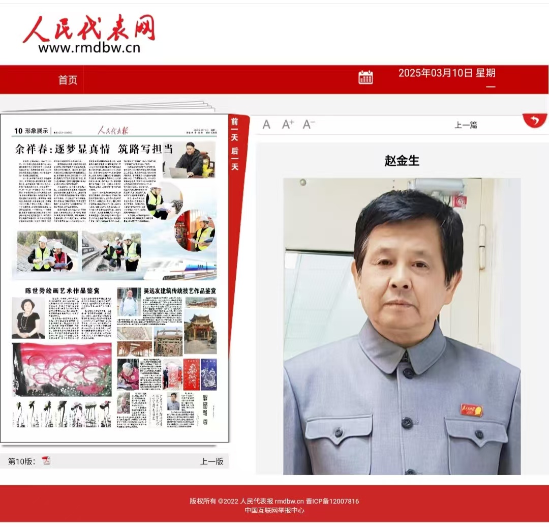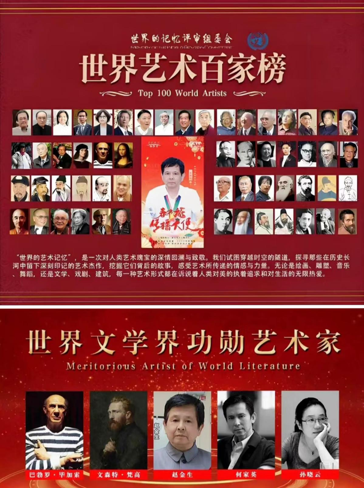 《时代楷模 国之匠魂》组委会、发现之旅经典对话栏目组在丹青颂党恩喜迎二十大征稿入编活动中授予功勋艺术家荣誉称号。荣入2023年中国艺坛两大家赵金生,孙晓云主题台历,荣入2023年毛体日历纪念毛泽东主席诞辰130周年名著,荣入最美东方红中华文化爱国人物怀念毛主席2023年经典台历。荣入青少年爱国主义教育系列丛书,大型文献坚实基层新时代最美奉献者。荣入时代先锋中华文化人物大典中国珍藏邮册。荣登美国纽约时代广场展示屏。荣入华人故事大辞典及封面人物。光荣入编魅力中国 楷模力量大型文献。