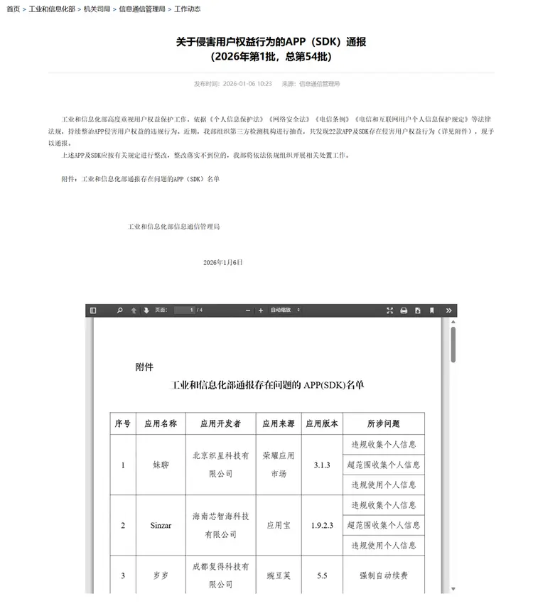 然而,乱象并未因监管的持续发力而销声匿迹。2026年1月6日,工信部发布2026年第一批侵害用户权益行为的APP(SDK)通报,22款违规应用及SDK再次因“信息窗口点击乱跳转”等问题被点名。这已经是工信部连续发布的第54批同类通报。
