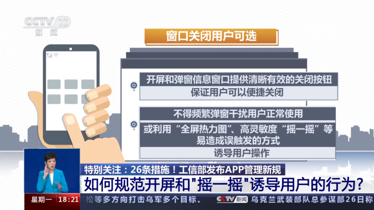 自2021年7月起,工信部、市场监管总局、中央网信办等部门先后出台多项规定,要求“摇一摇”广告需转动手机35°、持续3秒以上才可跳转;广告需设置明显的跳过、关闭按钮,标注跳转第三方提示;信息窗口跳转需征得用户明确同意等。