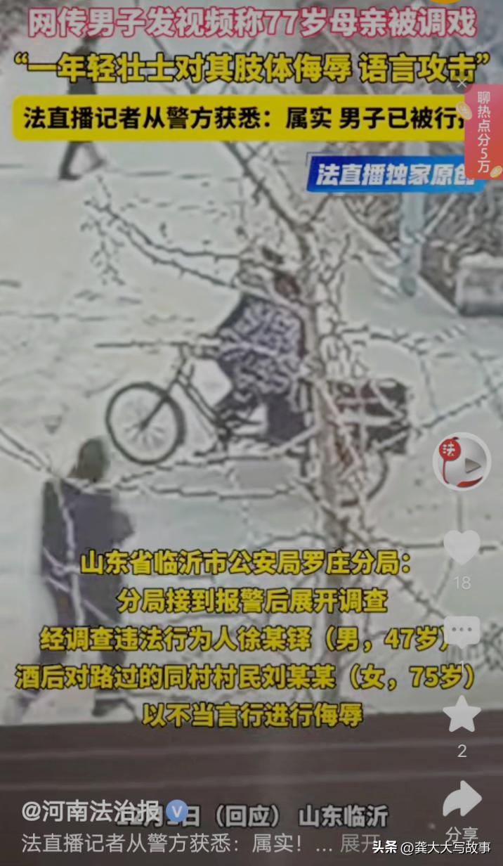 警方接警后,通过监控视频,调查走访,违法行为人徐某铎,今年47岁,他酒后对同村村民75岁老太刘某某,以不当言行进行侮辱,根据《治安管理处罚法》规定,已经将徐某铎行政拘留。