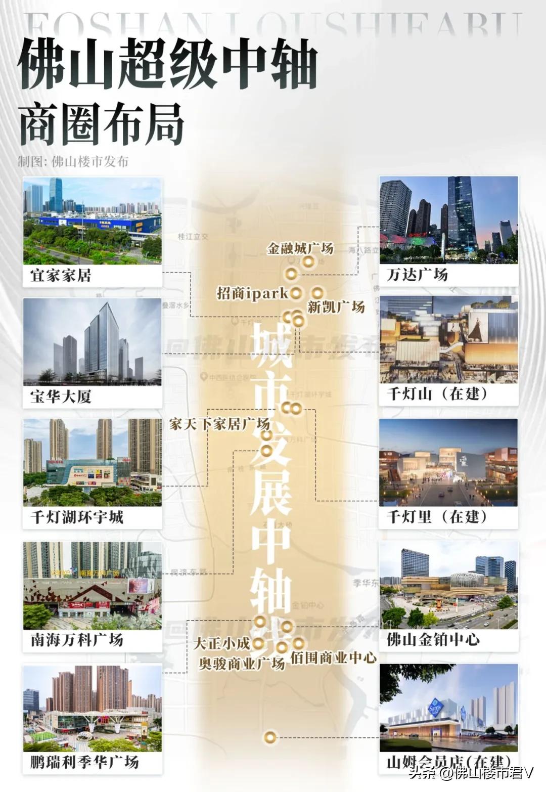 诸如千灯湖环宇城、佛山金铂中心等超10座商业体沿城市中轴排布,密度堪比万博CBD。