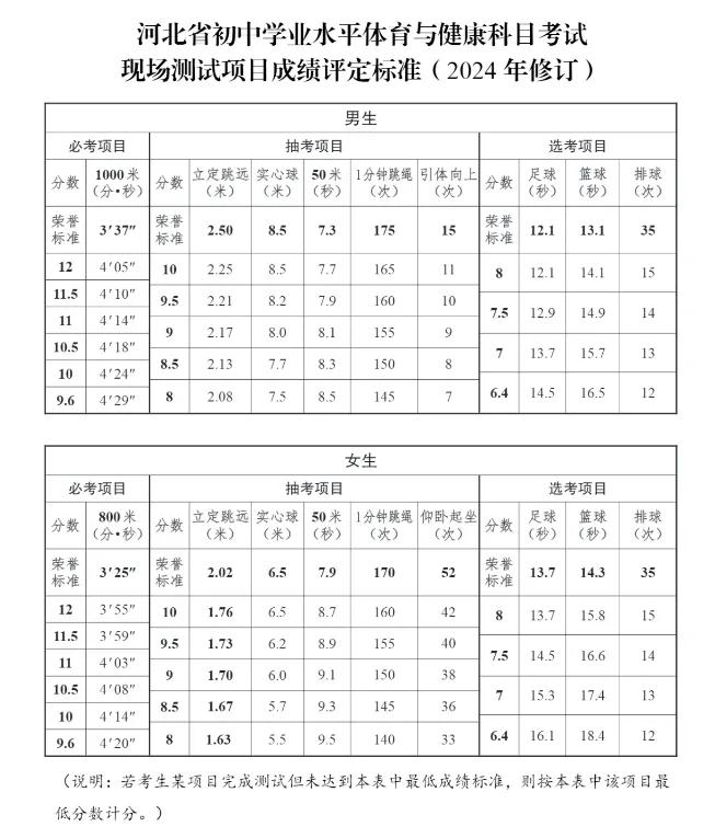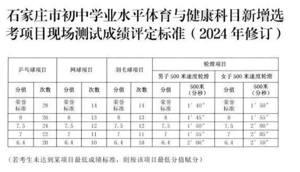 至此,2026年石家庄中考体育现场测试的“全貌”已经清晰呈现,主要分为三大类,共30分。第一类是必考项目,满分为12分,男生1000米,女生800米,这是耐力与意志的“硬核”考验。第二类是抽考项目1分钟跳绳,满分为10分,恭喜大家,抽中了满分率较高的项目;第三类是选考项目,满分为8分,石家庄考生可以在这七个项目中自主选择:①足球运球绕杆;②篮球运球绕杆;③排球正面双手垫球;④羽毛球正反手击球;⑤乒乓球正反手击球;⑥网球正反手击球;⑦500米轮滑。