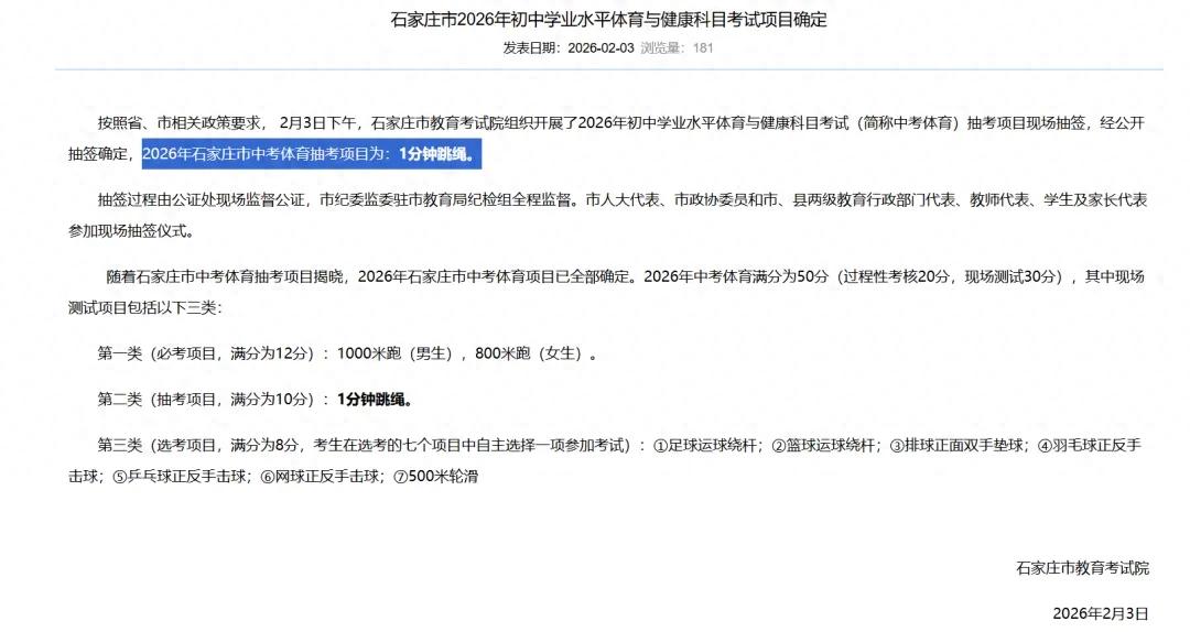 真是应了那句“说曹操,曹操就到”!前两天还在讨论石家庄中考体育抽考项目——跳绳or50米?昨天,石家庄教育部门就为这届初三家长和考生打开了这个“盲盒”——2026年石家庄中考体育的抽考项目正式确定为:1分钟跳绳。消息一出,不少初三家长群里瞬间“松了一口气”。我敢说,这一结果对绝大多数考生来说,绝对是“上上签”!为什么?因为相比其他选项(50米跑),1分钟跳绳绝对是抽考项目里最容易拿到满分的那一个!