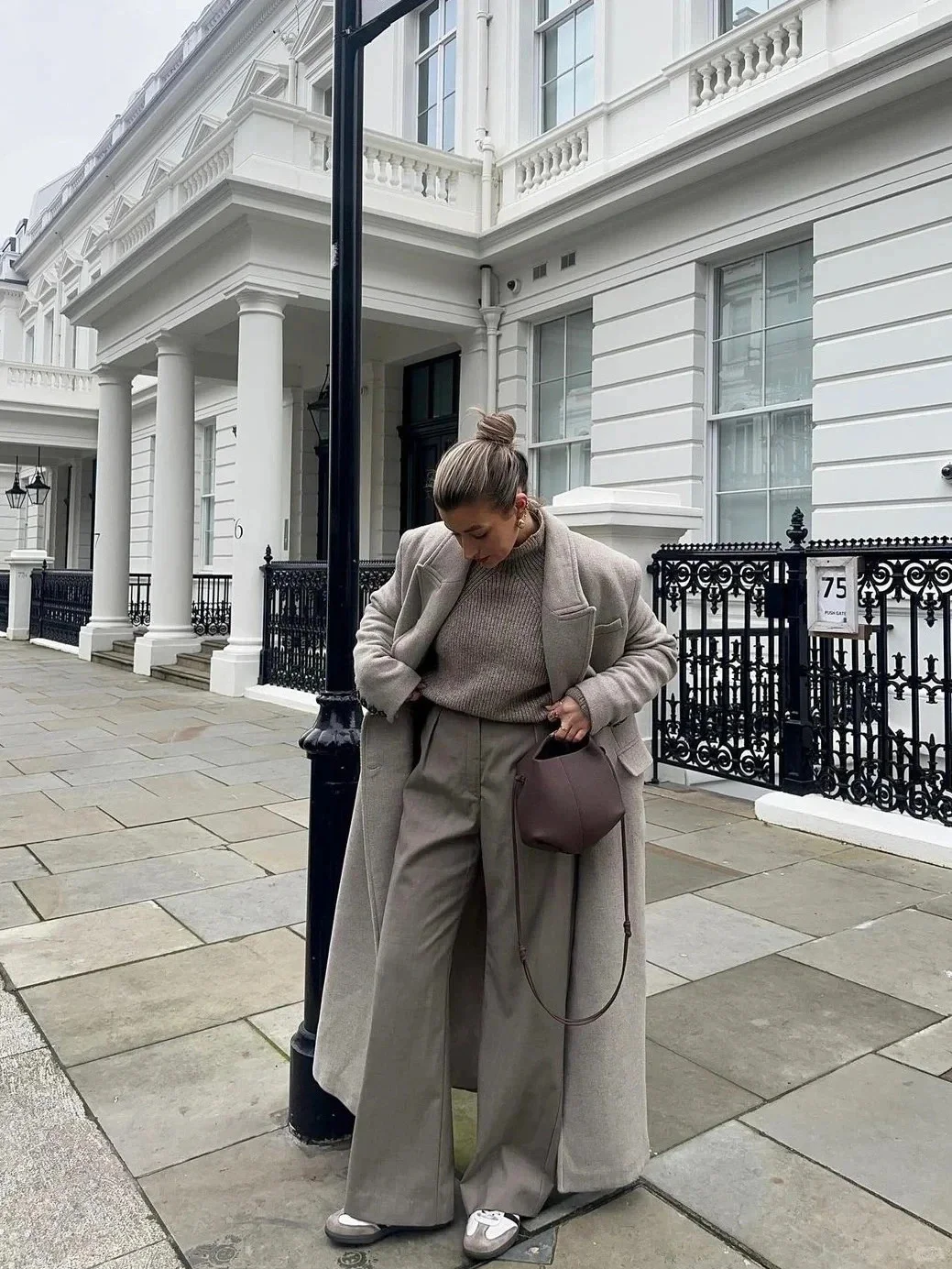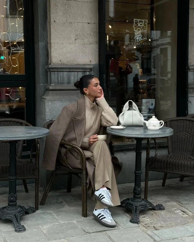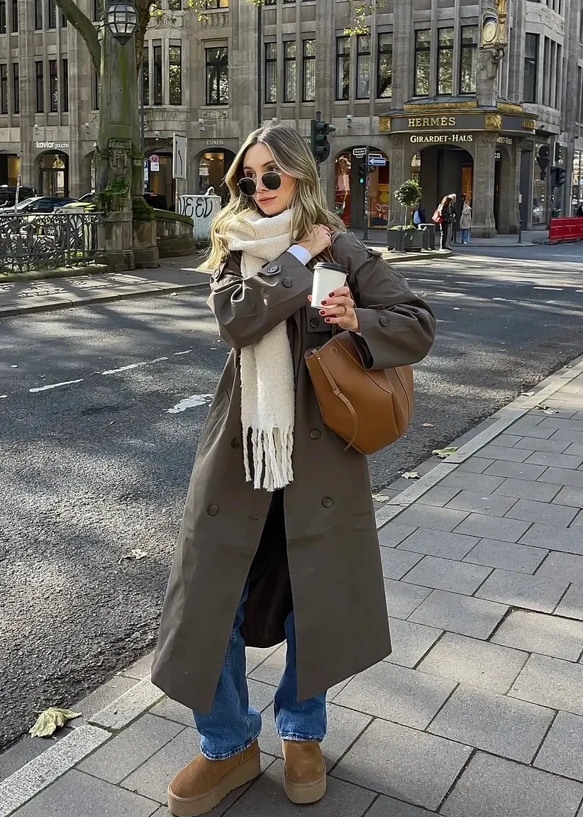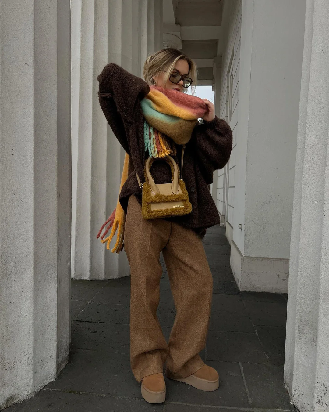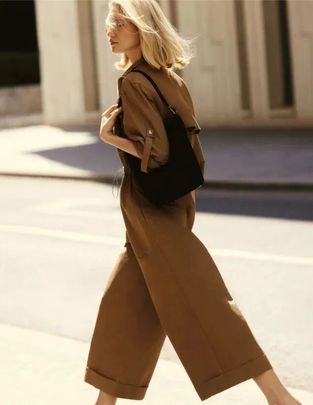 卡其色偏浅、咖色偏深,同属大地色系,搭配起来毫无违和感。咖色阔腿裤和围巾形成上下呼应,让造型从上衣到配饰形成完整视觉链,避免松散,自带 “显贵” 属性。