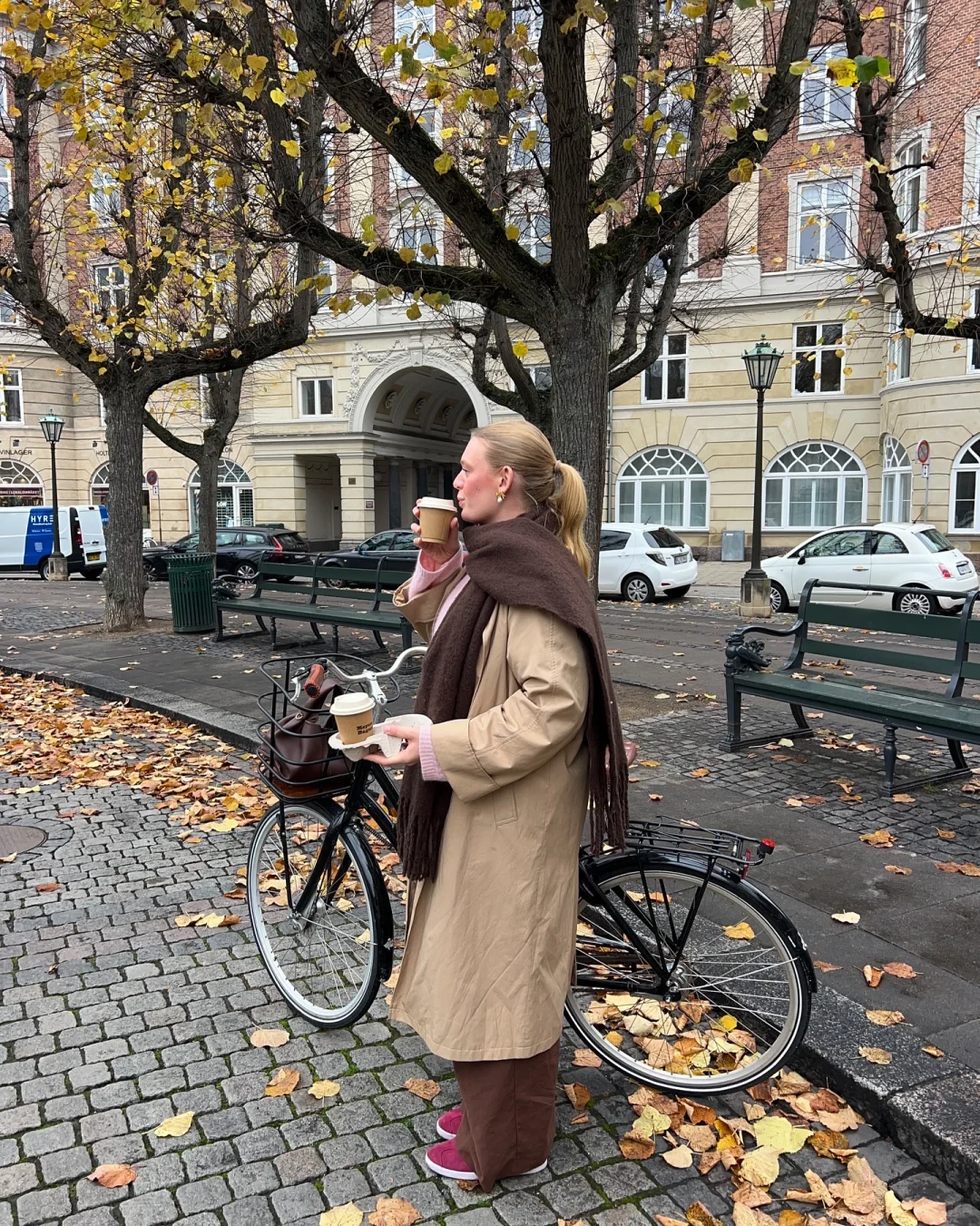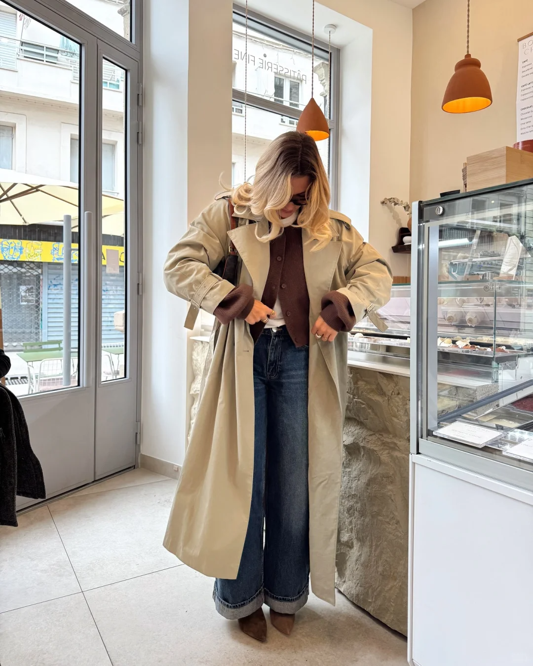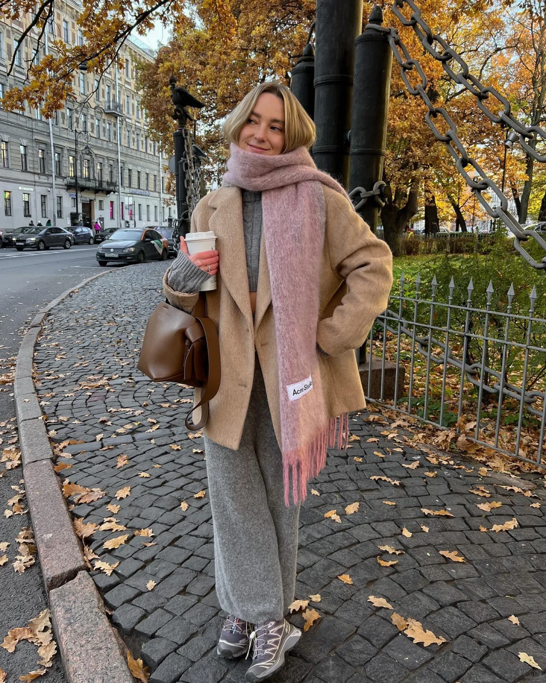卡其色偏浅、咖色偏深,同属大地色系,搭配起来毫无违和感。咖色阔腿裤和围巾形成上下呼应,让造型从上衣到配饰形成完整视觉链,避免松散,自带 “显贵” 属性。