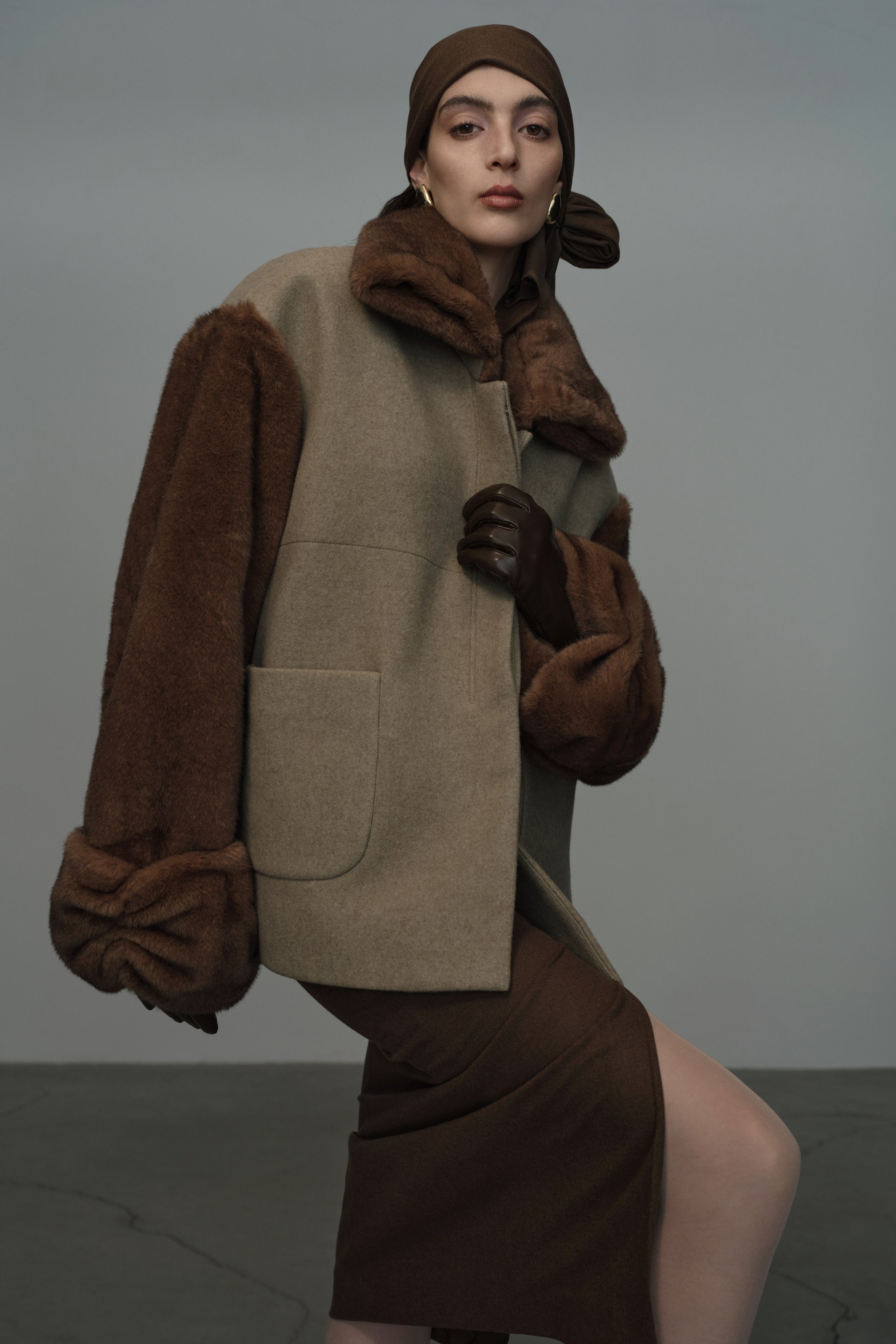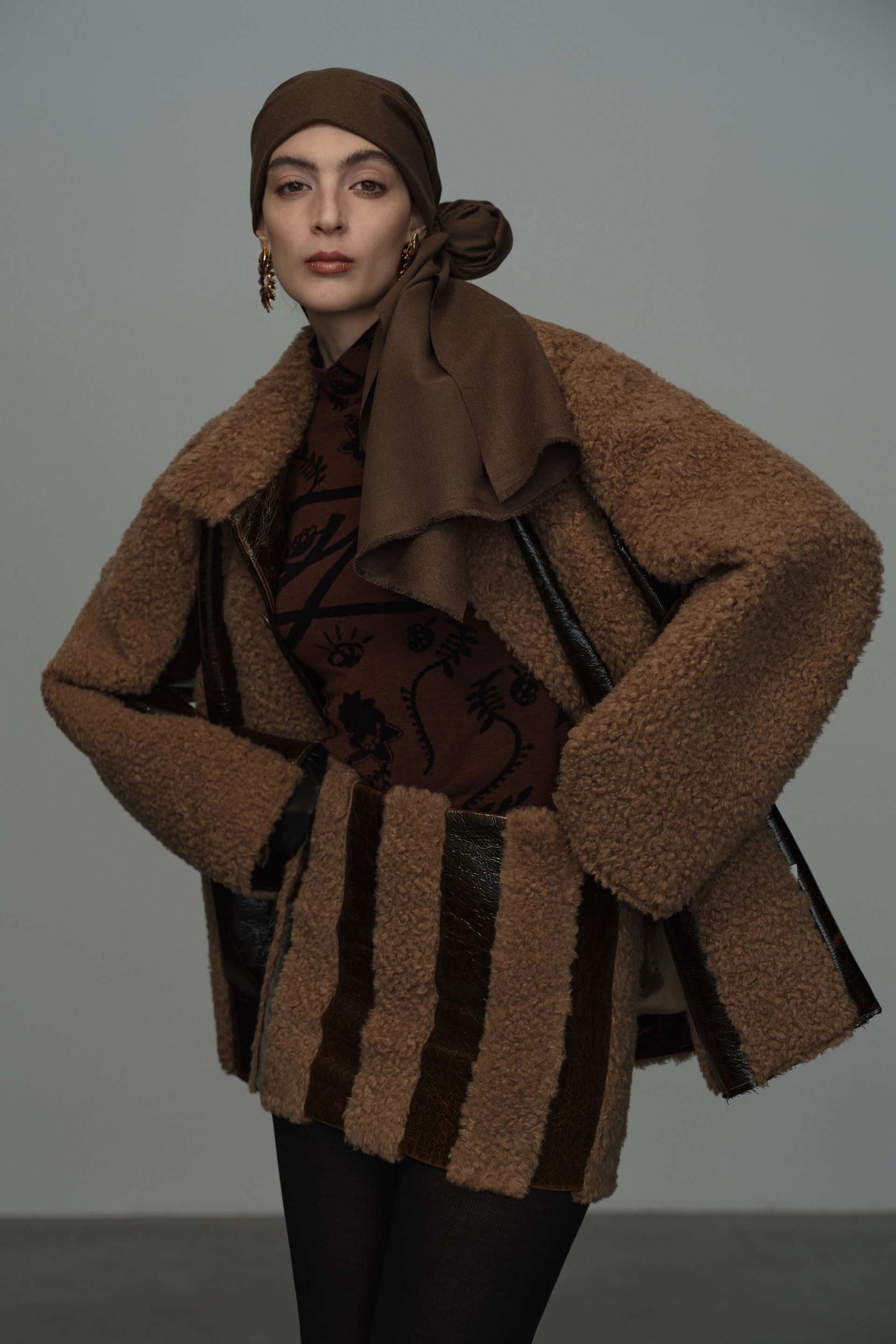 全身同一种棕色,通过不同面料的碰撞来营造高级感。