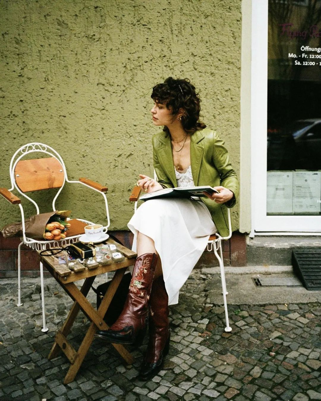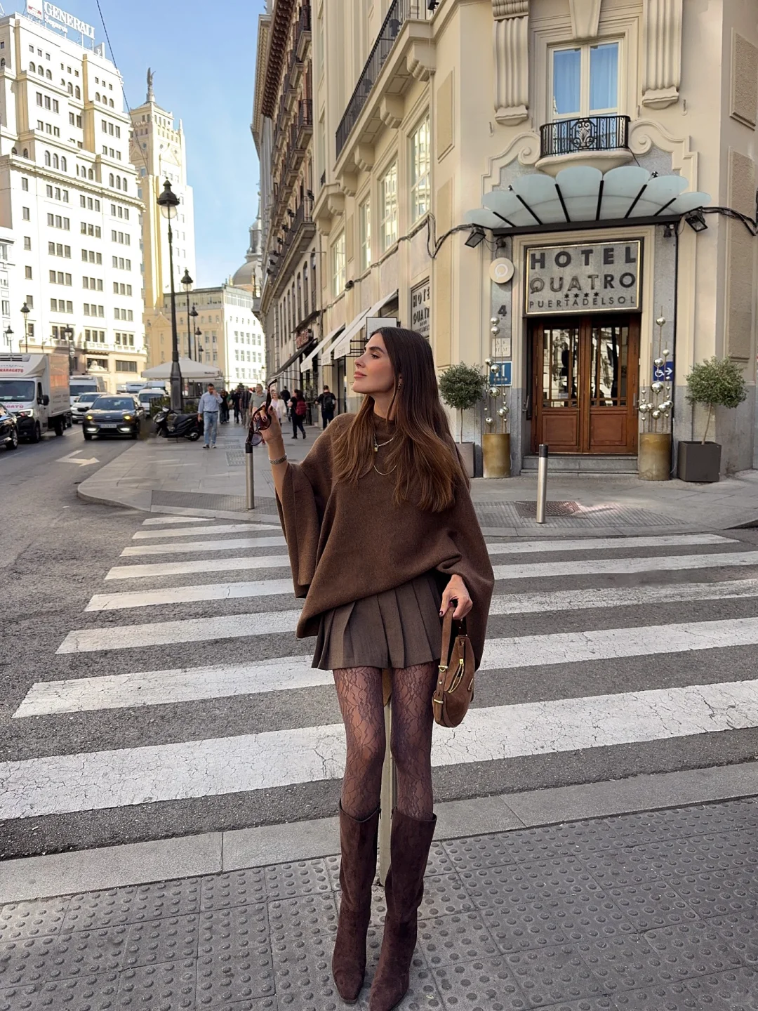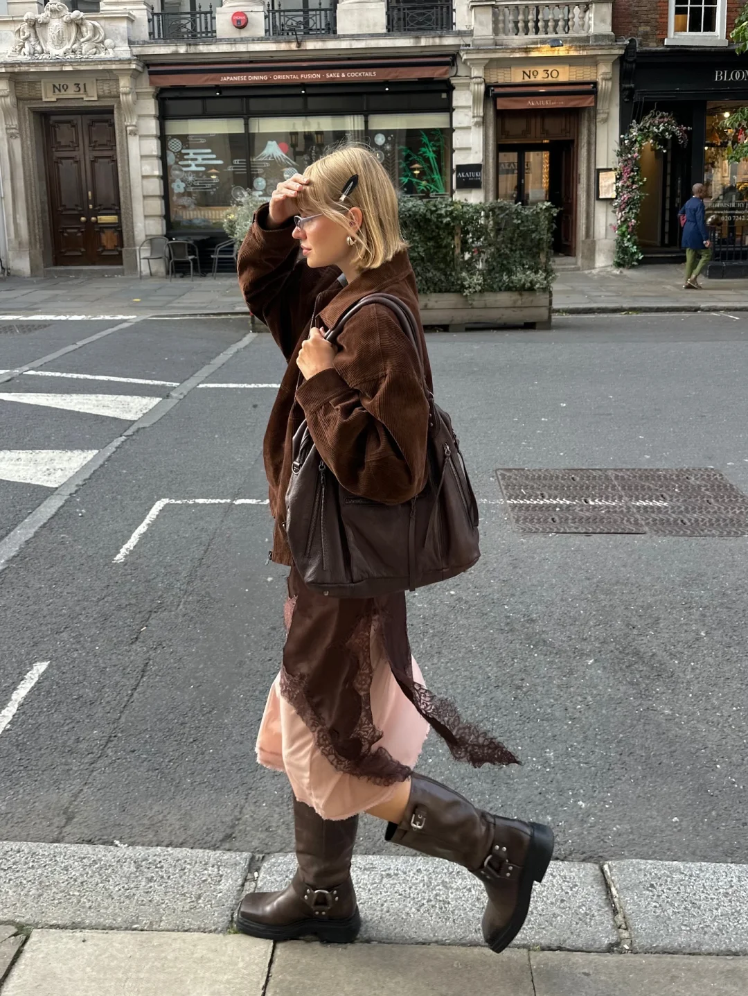 棕色长靴简直是过渡季 “乱穿衣” 的灵魂单品!搭裙子、短裤露一小截皮肤,既显腿长又能平衡温度,还能精准契合美拉德的暖调氛围~