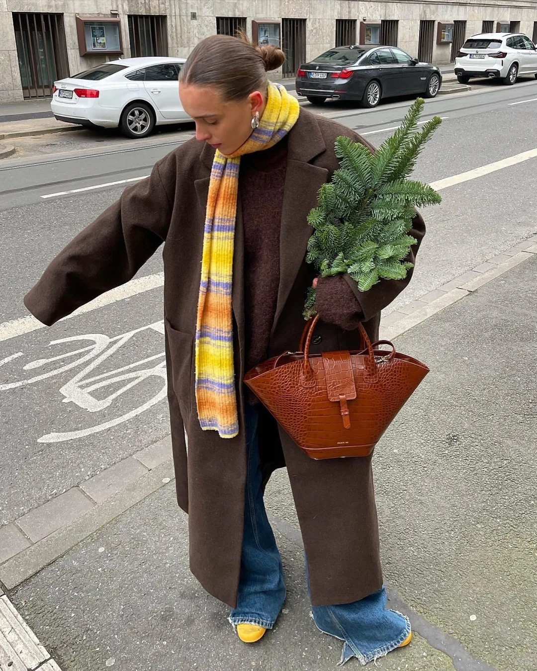 咖色偏浅暖、深棕色偏厚重,同属大地色系,搭配起来毫无违和感。深棕色包包作为视觉焦点,和咖色大衣形成自然渐变,避免造型松散,自带「低调显贵」的气场。
