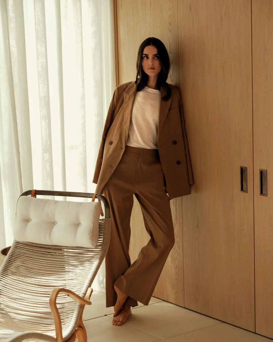 棕色西装套装容易显沉闷或老气,内搭白色是职场最稳妥不出错的选择,既干净又能衬出棕色的质感。白色的清爽能打破棕色的沉闷,让整体造型更显利落,避免显老气。
