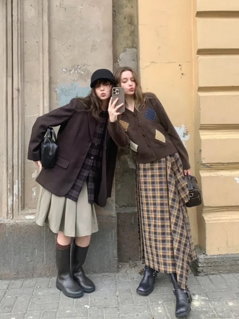 裙子选米色、浅咖色或格纹款,和棕色长靴形成暖调呼应,细节感拉满。