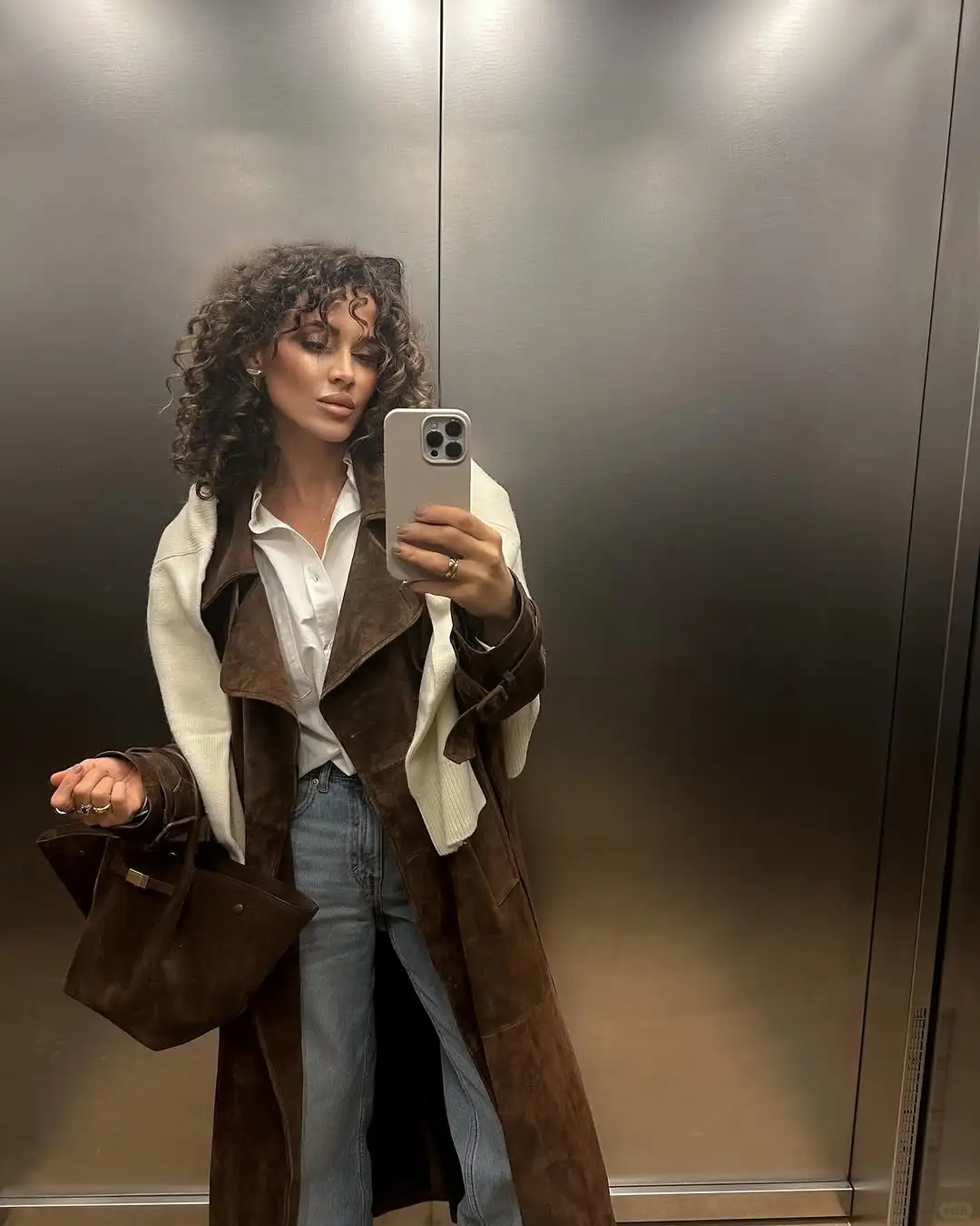 咖色麂皮外套自带复古柔软质感,白衬衫利落清爽,蓝色牛仔裤休闲百搭,白色针织披肩增添温柔感,四种材质软硬结合,打破单一穿搭的单调,让整体造型更有丰富度和质感。