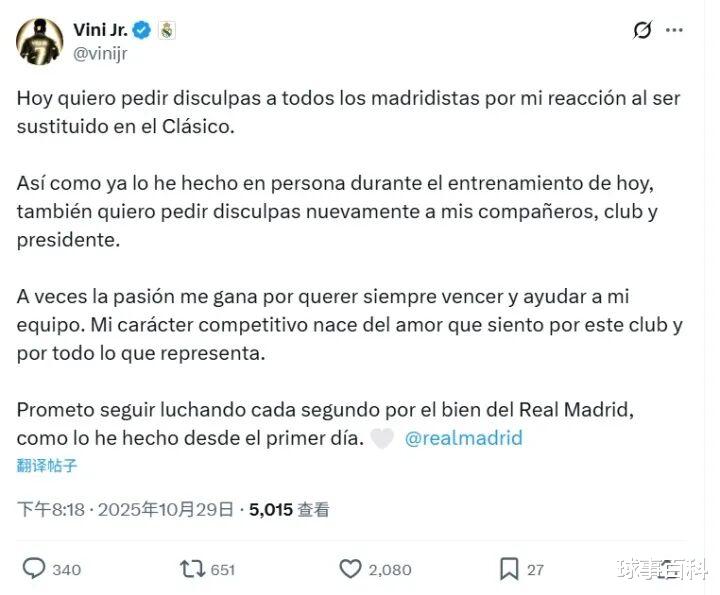他写道:“今天,我想就我在国家德比中被换下时的反应向所有马德里球迷道歉。正如我今天在训练中亲自所做的那样,我也想再次向我的队友、俱乐部和主席道歉。