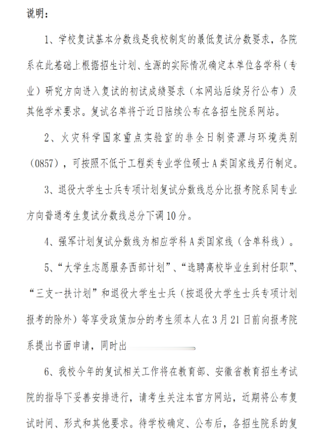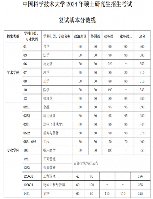 中国科学技术大学2024年硕士研究生招生考试复试基本分数线
