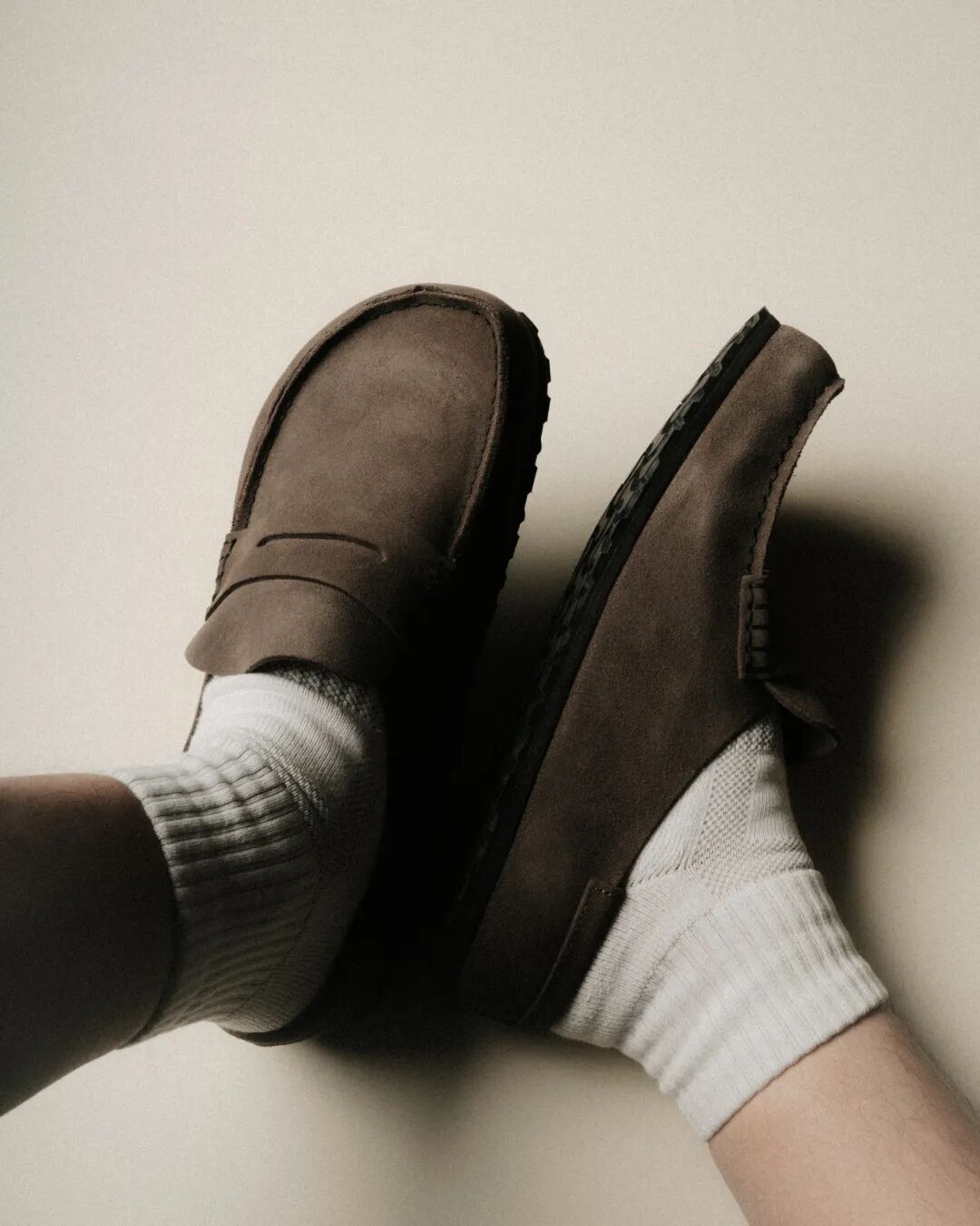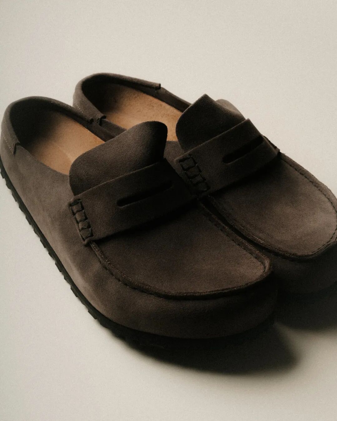 沿着「方头」设计的路线,我们再来看看 Birkenstock 的「方头」拖鞋 Naples Wrapped。这款鞋鞋型设计上神似 LOEWE Campo,不过一脚蹬的设计还是带来很大的便利性。再说鞋款的用料都不差,也有不同配色、不同材质的选择,比如麂皮、油蜡皮、牛皮革。宽版的设计也不用过多的磨合,舒适度直接给到。