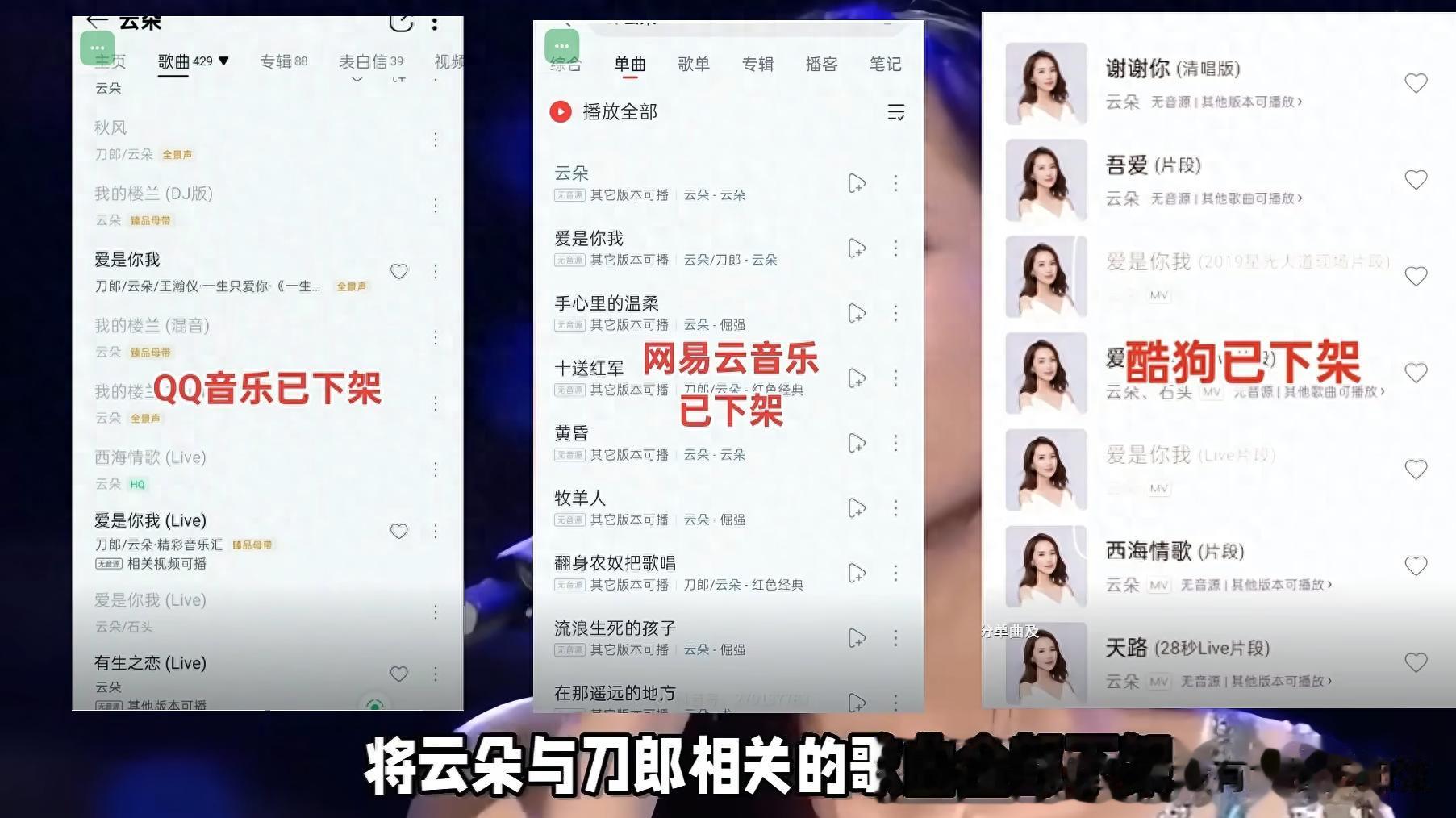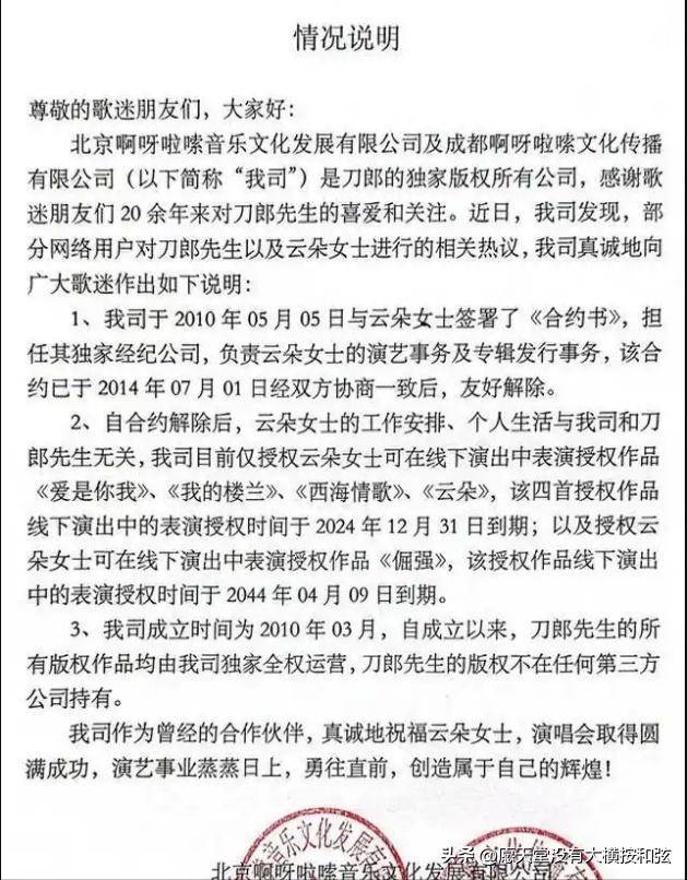 2024 年 10 月,刀郎公司提前三个月发函通知云朵,授权到期后将收回所有权利。云朵未在期限内下架相关内容,仍在商业演出中演唱《我的楼兰》。并未向刀郎方申请和支付有关授权费。2025 年 7 月,各大音乐平台应版权方要求下架云朵版本,线下演出主办方因法律风险取消相关场次。其中对于此次事件的核心关键:刀郎版权方代表公司“北京啊呀啦嗦音乐文化发展有限公司”做出了申明,关键信息如下:
