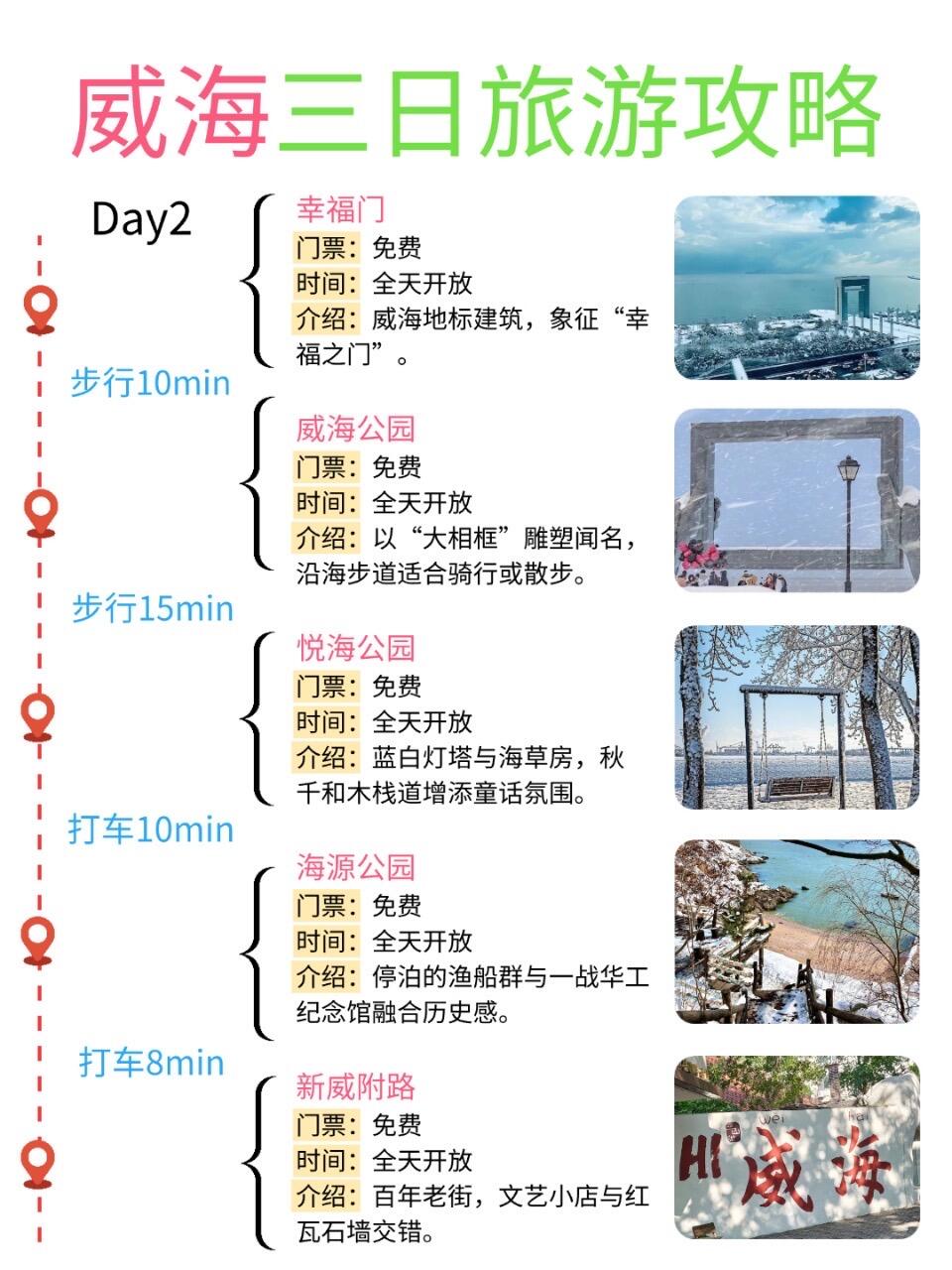 🤔行程都在市区。从地标幸福门开始,然后去威海公园打卡“大相框”,接着走到悦海公园,和灯塔、秋千拍拍照。📷下午去海源公园,看看成片的渔船,感受一下历史。最后逛逛新威附路,这条百年老街文艺气息很浓。