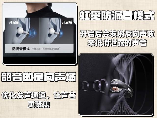 耳夹式耳机毕竟不是封闭式设计,声音难免会从缝隙里跑到外面,也就是咱们常说的漏音。说实话,基本所有耳夹式耳机都有这问题,想彻底解决挺难的,所以选的时候可以多留意下防漏音处理,比如虹觅自己研发的防漏音模式,还有韶音的定向声场技术技术,这些都是业内口碑不错的方案。